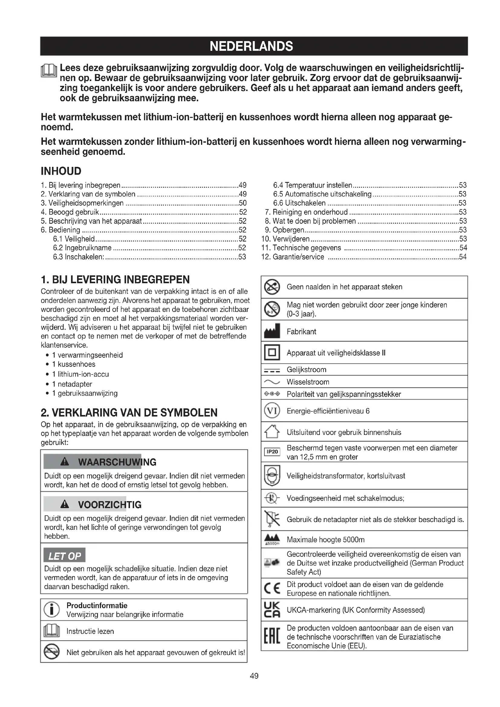 Op het apparaat, in de gebruiksaanwijzing, op de verpakking en op het typeplaatje van het apparaat worden de volgende symbolen gebruikt: WAARSCHUWING Duidt op een mogelijk dreigend gevaar. Indien dit niet vermeden wordt, kan het de dood of ernstig letsel tot gevolg hebben. VOORZICHTIG Duidt op een mogelijk dreigend gevaar. Indien dit niet vermeden wordt, kan het lichte of geringe verwondingen tot gevolg hebben. LET OP Duidt op een mogelijk schadelijke situatie. Indien deze niet vermeden wordt, kan de apparatuur of iets in de omgeving daarvan beschadigd raken. Productinformatie Verwijzing naar belangrijke informatie Instructie lezen Niet gebruiken als het apparaat gevouwen of gekreukt is! Geen naalden in het apparaat steken Mag niet worden gebruikt door zeer jonge kinderen (0-3 jaar). Fabrikant Apparaat uit veiligheidsklasse II Gelijkstroom Wisselstroom Polariteit van gelijkspanningsstekker Energie-eciëntieniveau 6 Uitsluitend voor gebruik binnenshuis IP20 Beschermd tegen vaste voorwerpen met een diameter van 12,5 mm en groter Veiligheidstransformator, kortsluitvast Voedingseenheid met schakelmodus; Gebruik de netadapter niet als de stekker beschadigd is. Maximale hoogte 5000m Gecontroleerde veiligheid overeenkomstig de eisen van de Duitse wet inzake productveiligheid (German Product Safety Act) Dit product voldoet aan de eisen van de geldende Europese en nationale richtlijnen. UKCA-markering (UK Conformity Assessed) De producten voldoen aantoonbaar aan de eisen van de technische voorschriften van de Euraziatische Economische Unie (EEU). INHOUD Lees deze gebruiksaanwijzing zorgvuldig door. Volg de waarschuwingen en veiligheidsrichtlij- nen op. Bewaar de gebruiksaanwijzing voor later gebruik. Zorg ervoor dat de gebruiksaanwij- zing toegankelijk is voor andere gebruikers. Geef als u het apparaat aan iemand anders geeft, ook de gebruiksaanwijzing mee. Het warmtekussen met lithium-ion-batterij en kussenhoes wordt hierna alleen nog apparaat ge