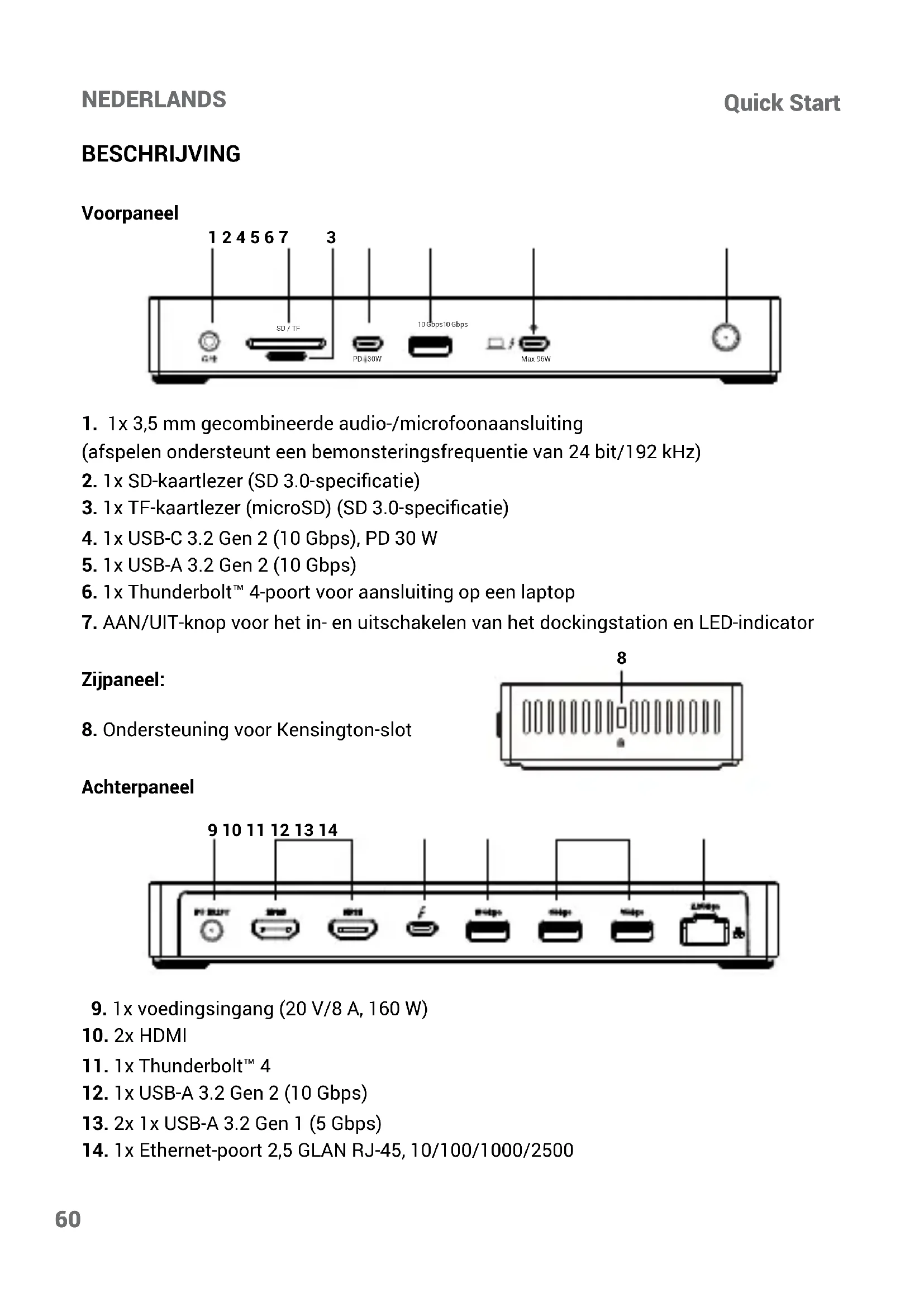 VOORZIENING - Voordat u de apparatuur aansluit op een stopcontact, moet u de nominale spanning controleren en ervoor zorgen dat de vereiste spanning en frequentie overeenkomen met de beschikbare voedingsbron. - Zorg ervoor dat de computer, monitor en aangesloten apparaten de juiste nominale stroomsterkte hebben om te werken met de voedingsadapter die in uw gebied is aan- gesloten. - Als het netsnoer beschadigd is, steek het dan niet in het stopcontact. - Om elektrische schokken te voorkomen, dient u de netsnoeren van de apparatuur aan te sluiten op correct geaarde stopcontacten. Als de apparatuur is uitgerust met een driepo- lig netsnoer, mag u geen adapterstekkers gebruiken die de aardingsfunctie omzeilen of het aardingselement uit de stekker of adapter verwijderen. - Als u een verlengsnoer gebruikt, zorg er dan voor dat het totale nominale vermogen van de aangesloten producten niet hoger is dan de nominale stroom van het verlengsnoer. - Als u een verlengsnoer of splitter moet gebruiken, zorg er dan voor dat het verlengsnoer of de splitter is aangesloten op een stopcontact en niet op een ander verlengsnoer of splitter. Het verlengsnoer of de splitter moet ontworpen zijn voor geaarde stekkers en in een geaard stopcontact worden gestoken. - Als u een splitter met meerdere stopcontacten gebruikt, moet u voorzichtig zijn wan- neer u het netsnoer in de splitter steekt. Bij sommige splitters kan de stekker verkeerd worden aangesloten. Een onjuiste aansluiting van de stekker kan permanente schade aan de apparatuur veroorzaken en kan ook een risico op elektrische schokken of brand inhouden. Zorg ervoor dat het aardingsuiteinde van de stekker in het aardingscontact van de splitter is gestoken. - Trek aan de stekker en niet aan het snoer als u de stekker uit het stopcontact haalt. - Gebruik alleen een voedingsadapter die is geleverd door i-tec technologies s.r.o. en die is goedgekeurd voor gebruik met dit apparaat. Gebruik van een andere voedingsadapter kan brand of een explosie veroorzaken. - Als u de voedingsadapter gebruikt om een computer van stroom te voorzien of een bat- terij op te laden, plaats deze dan in een geventileerde ruimte, zoals op een bureau of op de vloer. Bedek de stroomadapter niet met papier of andere voorwerpen die de koeling kunnen verminderen. Gebruik de netadapter niet in de draagtas. - De netadapter kan heet worden tijdens normaal gebruik van het dockingstation of de computer. - Wees voorzichtig bij het hanteren van de adapter tijdens of onmiddellijk na het gebruik. - We raden aan om de adapter op de grond of op tafel te leggen zodat het indicatorlampje zichtbaar is. Zo weet u meteen wanneer de adapter wordt uitgeschakeld door invloeden van buitenaf. Als het groene lampje om de een of andere reden uitgaat, haal dan de stekker 10 seconden uit het stopcontact en sluit hem daarna weer aan. - Gebruik nooit een adapter die tekenen van schade of overmatige slijtage vertoont. VEELGESTELDE VRAGEN Beschikbaar op onze website www.i-tec.pro onder “FAQ” voor dit product65 NEDERLANDS TB5QUATTRODOCKPD VERKLARENDE WOORDENLIJST Interface / poort / connector / ingang / slot - de plaats waar twee apparaten fysiek met elkaar verbonden zijn. Controller - een halfgeleidercomponent (zogenaamde chipset) in een notebook/tablet, die zorgt voor de werking van een van de poorten. Thunderbolt™ - is een snelle hardware-interface waarmee je apparaten (randapparaten) op je computer kunt aansluiten via een uitbreidingsbus. Thunderbolt combineert PCI-Ex- press en DisplayPort in een seriële data-interface. Je kunt tot 6 extra Thunderbolt™ ap- paraten aansluiten en de overdrachtsnelheid voor Thunderbolt™ 3/4 is tot 40Gbit/s. USB-C / USB Type-C / USB4 / Thunderbolt™ 3/4 - is een symmetrische connector Maakt sneller opladen, stroom, dual-role (niet alleen host maar ook gast), ondersteuning voor Alt Mode (DisplayPort, MHL, Thunderbolt 3, Power Delivery) en foutmelding via Billboard-ap- paraat mogelijk. USB-C Power Delivery (USB-C PD) - een optionele functie van de USB-C connector. Een connector met deze ondersteuning kan zowel opladen als opgeladen worden, en onders- teunt belastingen van 10W tot 240W USB 3.2 / 3.1 / 3.0 / 2.0 - standaard voor USB-interface / poort voor het aansluiten van verschillende USB-apparaten. Verschillende USB-apparaten kunnen worden aangesloten op het dockingstation of de adapter via de USB Type-A-interface. De USB type B poort wordt gebruikt om het docking station of de adapter aan te sluiten op een laptop/tablet. HDMI/Display Port - Een standaard voor een digitale grasche interface/poort die wordt gebruikt om monitoren en andere grasche weergaveapparaten aan te sluiten. LAN (Local Area Network) - local area network, nu het meest gebruikt is het zogenaam- de Ethernet, dat theoretische overdrachtsnelheden tot 2,5 Gbit/s bereikt bij het docking station. Audio - een term voor een audio-invoer (microfoon) of uitvoerapparaat (koptelefoon/ luidsprekers).Quick Start