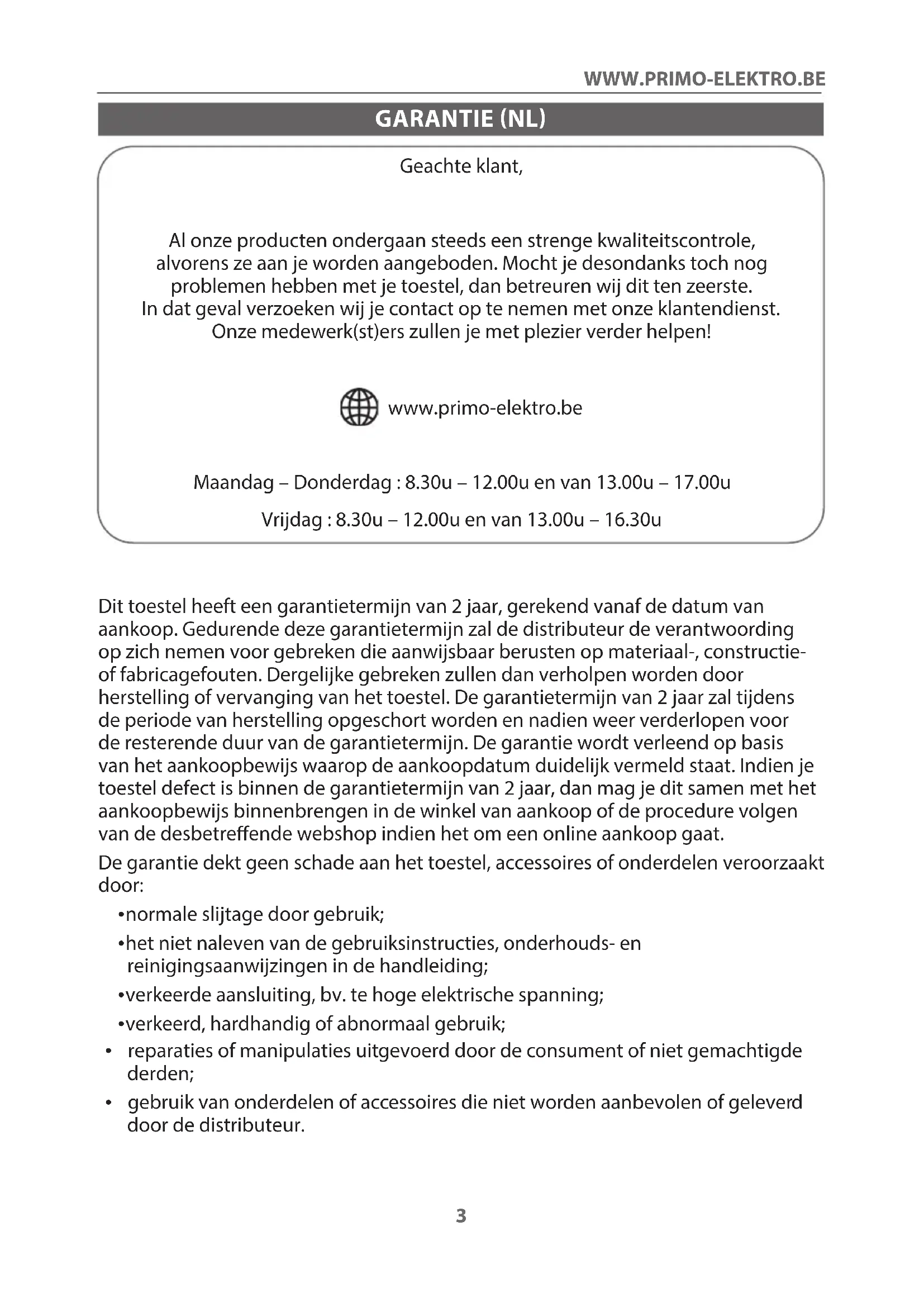 GARANTIE (NL) Geachte klant, Al onze producten ondergaan steeds een strenge kwaliteitscontrole, alvorens ze aan je worden aangeboden. Mocht je desondanks toch nog problemen hebben met je toestel, dan betreuren wij dit ten zeerste. In dat geval verzoeken wij je contact op te nemen met onze klantendienst. Onze medewerk(st)ers zullen je met plezier verder helpen! www.primo-elektro.be Maandag – Donderdag : 8.30u – 12.00u en van 13.00u – 17.00u Vrijdag : 8.30u – 12.00u en van 13.00u – 16.30u Dit toestel heeft een garantietermijn van 2 jaar, gerekend vanaf de datum van aankoop. Gedurende deze garantietermijn zal de distributeur de verantwoording op zich nemen voor gebreken die aanwijsbaar berusten op materiaal-, constructie- of fabricagefouten. Dergelijke gebreken zullen dan verholpen worden door herstelling of vervanging van het toestel. De garantietermijn van 2 jaar zal tijdens de periode van herstelling opgeschort worden en nadien weer verderlopen voor de resterende duur van de garantietermijn. De garantie wordt verleend op basis van het aankoopbewijs waarop de aankoopdatum duidelijk vermeld staat. Indien je toestel defect is binnen de garantietermijn van 2 jaar, dan mag je dit samen met het aankoopbewijs binnenbrengen in de winkel van aankoop of de procedure volgen van de desbetreende webshop indien het om een online aankoop gaat. De garantie dekt geen schade aan het toestel, accessoires of onderdelen veroorzaakt door: