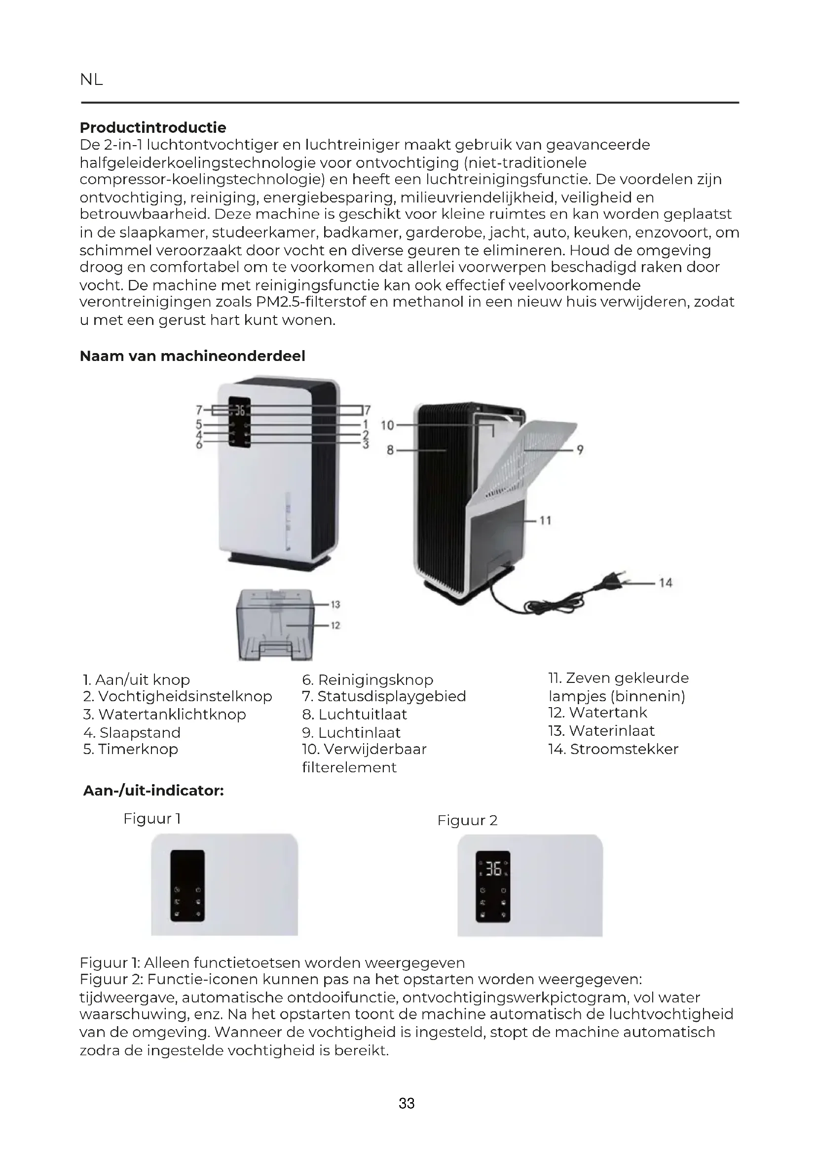 CATEGORIA Prixton AURA Dehumidifier Air purifier Home 32NL Productintroductie De 2-in-1 luchtontvochtiger en luchtreiniger maakt gebruik van geavanceerde halfgeleiderkoelingstechnologie voor ontvochtiging (niet-traditionele compressor-koelingstechnologie) en heeft een luchtreinigingsfunctie. De voordelen zijn ontvochtiging, reiniging, energiebesparing, milieuvriendelijkheid, veiligheid en betrouwbaarheid. Deze machine is geschikt voor kleine ruimtes en kan worden geplaatst in de slaapkamer, studeerkamer, badkamer, garderobe, jacht, auto, keuken, enzovoort, om schimmel veroorzaakt door vocht en diverse geuren te elimineren. Houd de omgeving droog en comfortabel om te voorkomen dat allerlei voorwerpen beschadigd raken door vocht. De machine met reinigingsfunctie kan ook effectief veelvoorkomende verontreinigingen zoals PM2.5-filterstof en methanol in een nieuw huis verwijderen, zodat u met een gerust hart kunt wonen. Naam van machineonderdeel Aan-/uit-indicator: