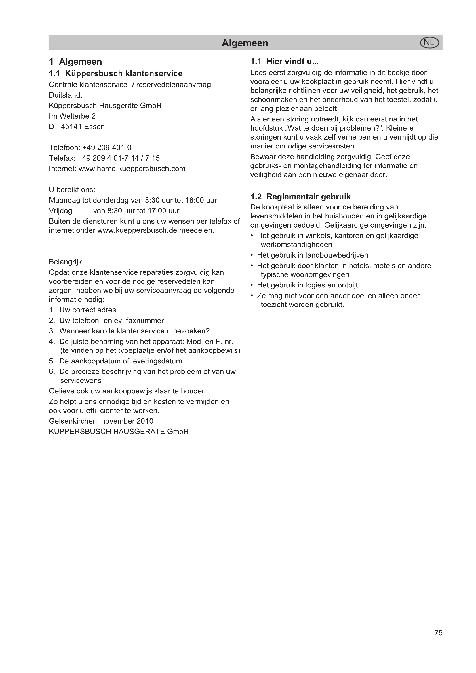 servicewens Gelieve ook uw aankoopbewijs klaar te houden. Zo helpt u ons onnodige tijd en kosten te vermijden en ook voor u effi ciënter te werken. Gelsenkirchen, november 2010 KÜPPERSBUSCH HAUSGERÄTE GmbHVeiligheidsaanwijzingen en waarschuwingen