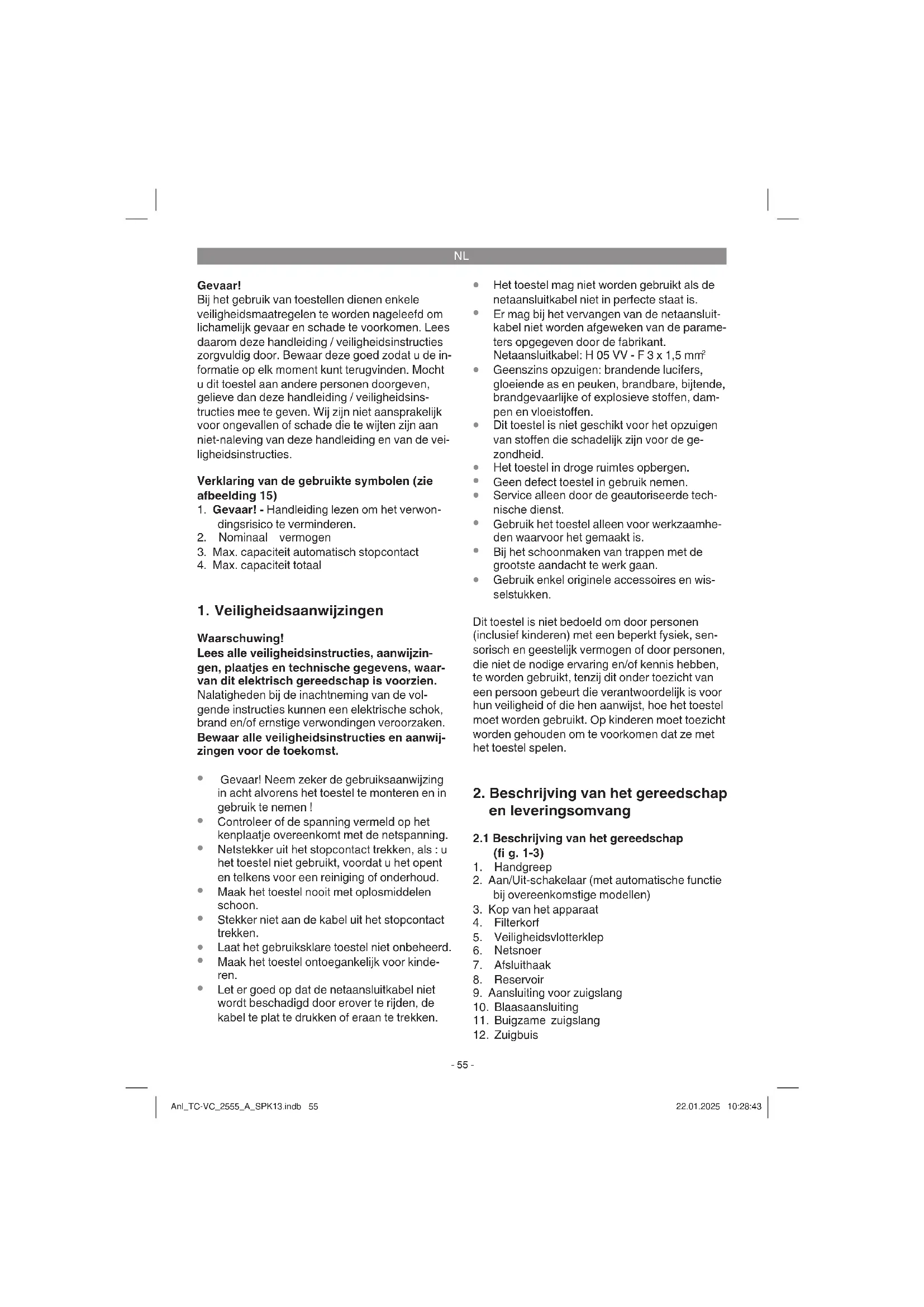 Sluit de netkabel van uw elektrisch gereedschap aan op het automatische stopcontact (21) en verbind de zuigslang (11) met de stofafzuigaans- luiting van uw elektrisch gereedschap. Let er wel op dat de gereedschappen goed vastzitten en luchtdicht verbonden zijn. Anl_TC-VC_2555_A_SPK13.indb 57Anl_TC-VC_2555_A_SPK13.indb 57 22.01.2025 10:28:4422.01.2025 10:28:44NL