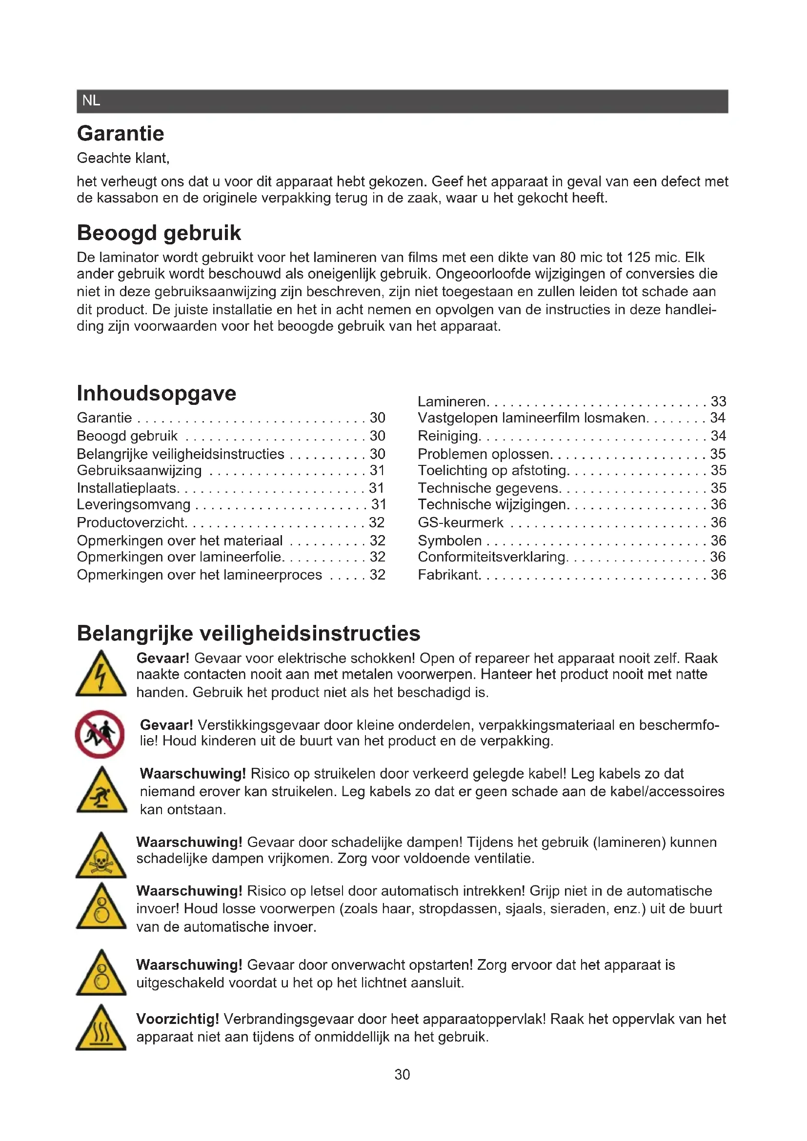- Garantie Geachte klant, het verheugt ons dat u voor dit apparaat hebt gekozen. Geef het apparaat in geval van een defect met de kassabon en de originele verpakking terug in de zaak, waar u het gekocht heeft. Beoogd gebruik De laminator wordt gebruikt voor het lamineren van lms met een dikte van 80 mic tot 125 mic. Elk ander gebruik wordt beschouwd als oneigenlijk gebruik. Ongeoorloofde wijzigingen of conversies die niet in deze gebruiksaanwijzing zijn beschreven, zijn niet toegestaan en zullen leiden tot schade aan dit product. De juiste installatie en het in acht nemen en opvolgen van de instructies in deze handlei- ding zijn voorwaarden voor het beoogde gebruik van het apparaat. Inhoudsopgave Garantie p. 30
