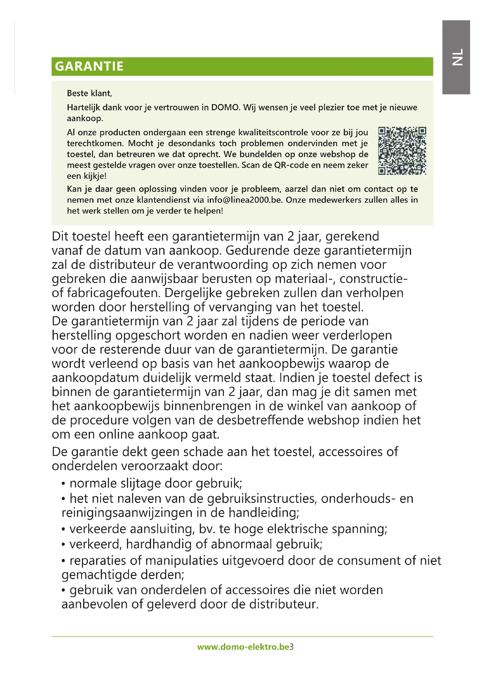 GARANTIE Beste klant, Hartelijk dank voor je vertrouwen in DOMO. Wij wensen je veel plezier toe met je nieuwe aankoop. Al onze producten ondergaan een strenge kwaliteitscontrole voor ze bij jou terechtkomen. Mocht je desondanks toch problemen ondervinden met je toestel, dan betreuren we dat oprecht. We bundelden op onze webshop de meest gestelde vragen over onze toestellen. Scan de QR-code en neem zeker een kijkje! Kan je daar geen oplossing vinden voor je probleem, aarzel dan niet om contact op te nemen met onze klantendienst via info@linea2000.be. Onze medewerkers zullen alles in het werk stellen om je verder te helpen! Dit toestel heeft een garantietermijn van 2 jaar, gerekend vanaf de datum van aankoop. Gedurende deze garantietermijn zal de distributeur de verantwoording op zich nemen voor gebreken die aanwijsbaar berusten op materiaal-, constructie- of fabricagefouten. Dergelijke gebreken zullen dan verholpen worden door herstelling of vervanging van het toestel. De garantietermijn van 2 jaar zal tijdens de periode van herstelling opgeschort worden en nadien weer verderlopen voor de resterende duur van de garantietermijn. De garantie wordt verleend op basis van het aankoopbewijs waarop de aankoopdatum duidelijk vermeld staat. Indien je toestel defect is binnen de garantietermijn van 2 jaar, dan mag je dit samen met het aankoopbewijs binnenbrengen in de winkel van aankoop of de procedure volgen van de desbetreende webshop indien het om een online aankoop gaat. De garantie dekt geen schade aan het toestel, accessoires of onderdelen veroorzaakt door: