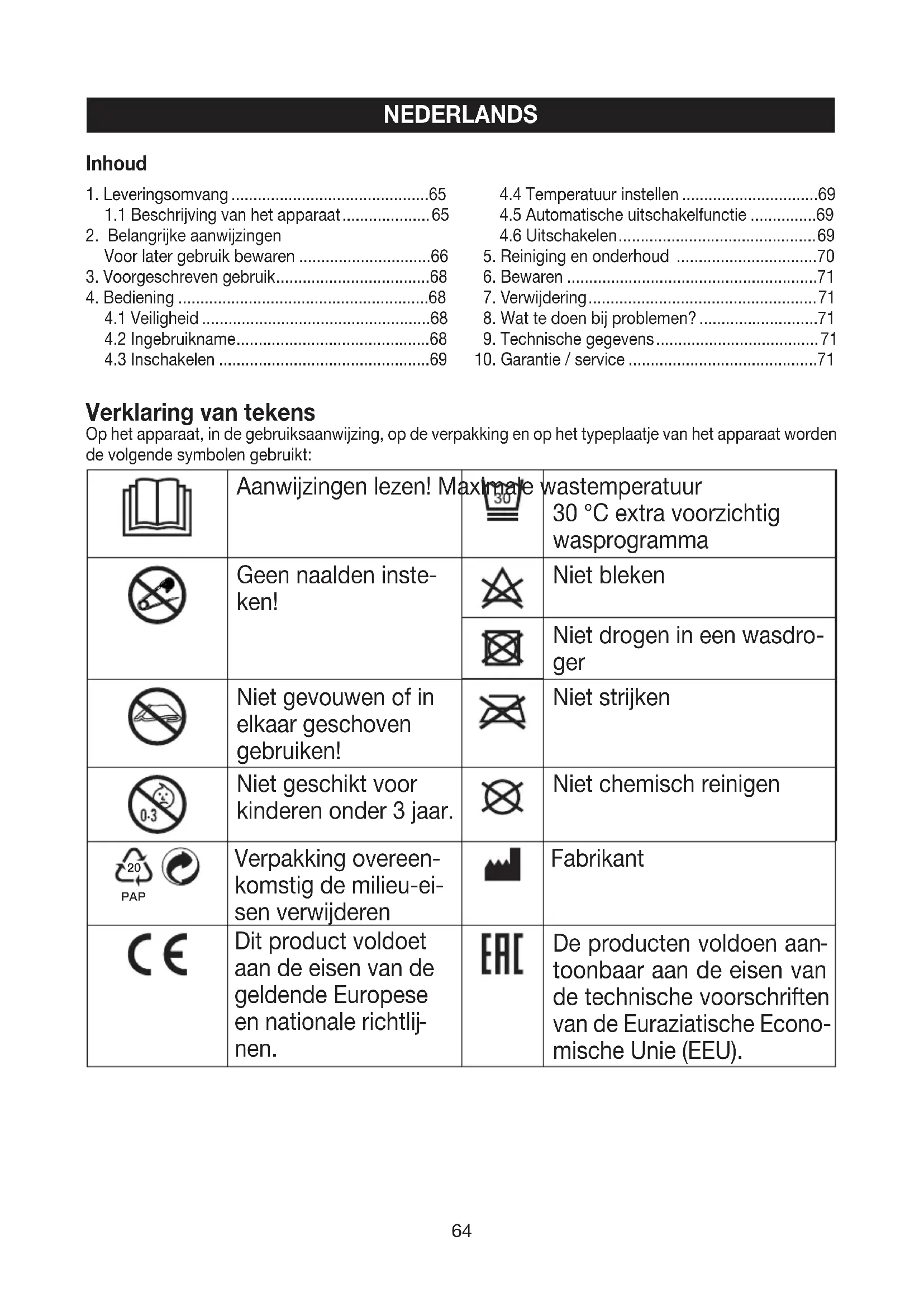 Szczegółowe informacje na temat gwarancji i warunków gwarancji znajdują się w załączonej ulotce gwa- rancyjnej. Zastrzega się prawo do pomyłek i zmian64 Verklaring van tekens Op het apparaat, in de gebruiksaanwijzing, op de verpakking en op het typeplaatje van het apparaat worden de volgende symbolen gebruikt: Aanwijzingen lezen! Maximale wastemperatuur 30°C extra voorzichtig wasprogramma Geen naalden inste- ken! Niet bleken Niet drogen in een wasdro- ger Niet gevouwen of in elkaar geschoven gebruiken! Niet strijken Niet geschikt voor kinderen onder 3jaar. Niet chemisch reinigen