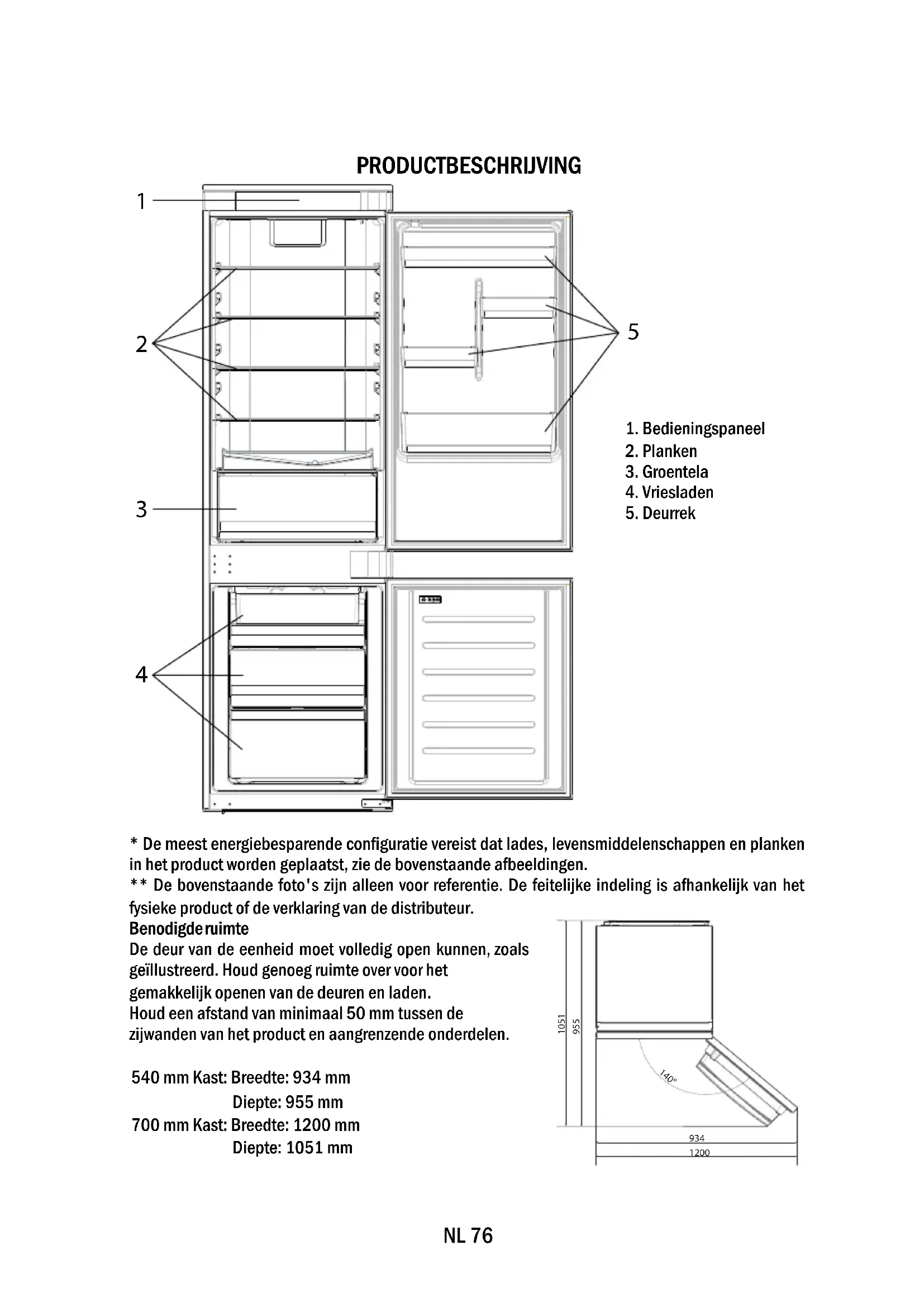 - De meest energiebesparende configuratie vereist dat lades, levensmiddelenschappen en planken in het product worden geplaatst, zie de bovenstaande afbeeldingen. ** De bovenstaande foto's zijn alleen voor referentie. De feitelijke indeling is afhankelijk van het fysieke product of de verklaring van de distributeur. Benodigde ruimte De deur van de eenheid moet volledig open kunnen, zoals geïllustreerd. Houd genoeg ruimte over voor het gemakkelijk openen van de deuren en laden. Houd een afstand van minimaal 50 mm tussen de zijwanden van het product en aangrenzende onderdelen. 540 mm Kast: Breedte: 934 mm Diepte: 955 mm 700 mm Kast: Breedte: 1200 mm Diepte: 1051 mm