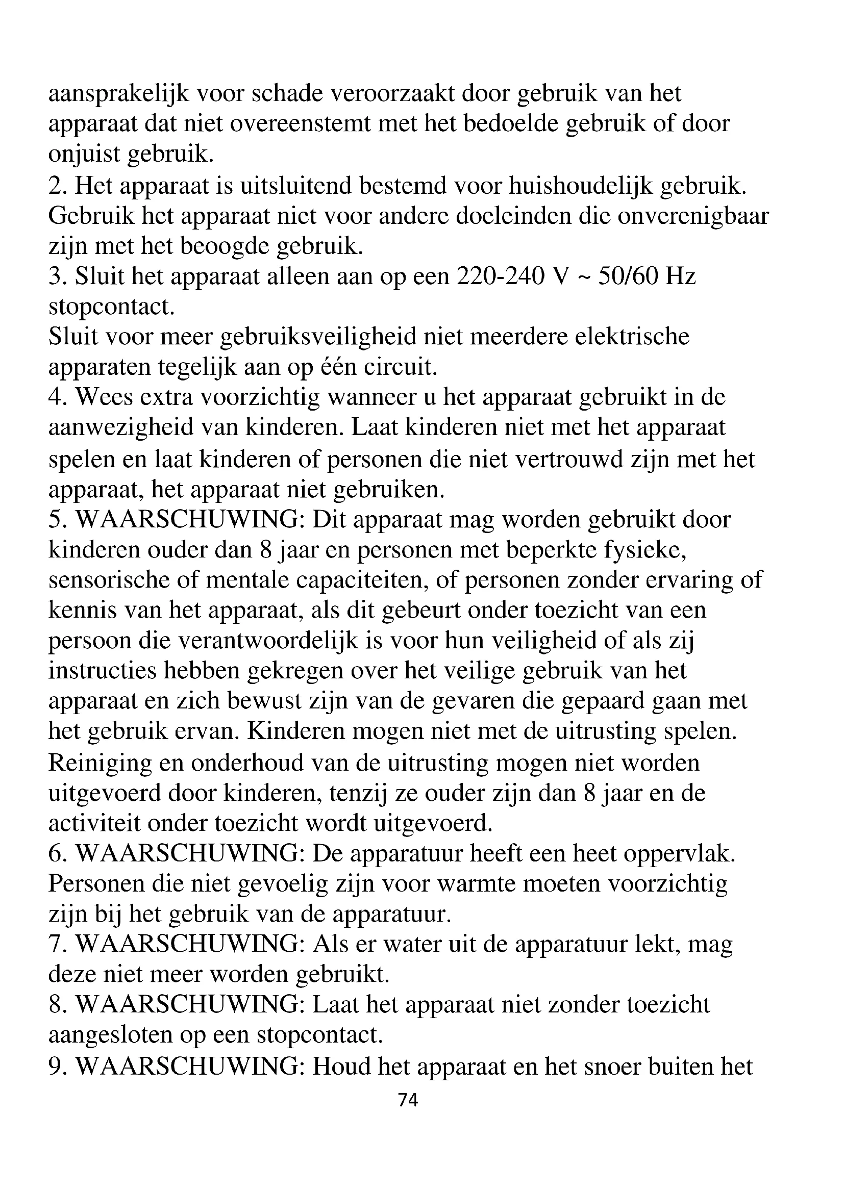 9. WAARSCHUWING: Houd het apparaat en het snoer buiten het75