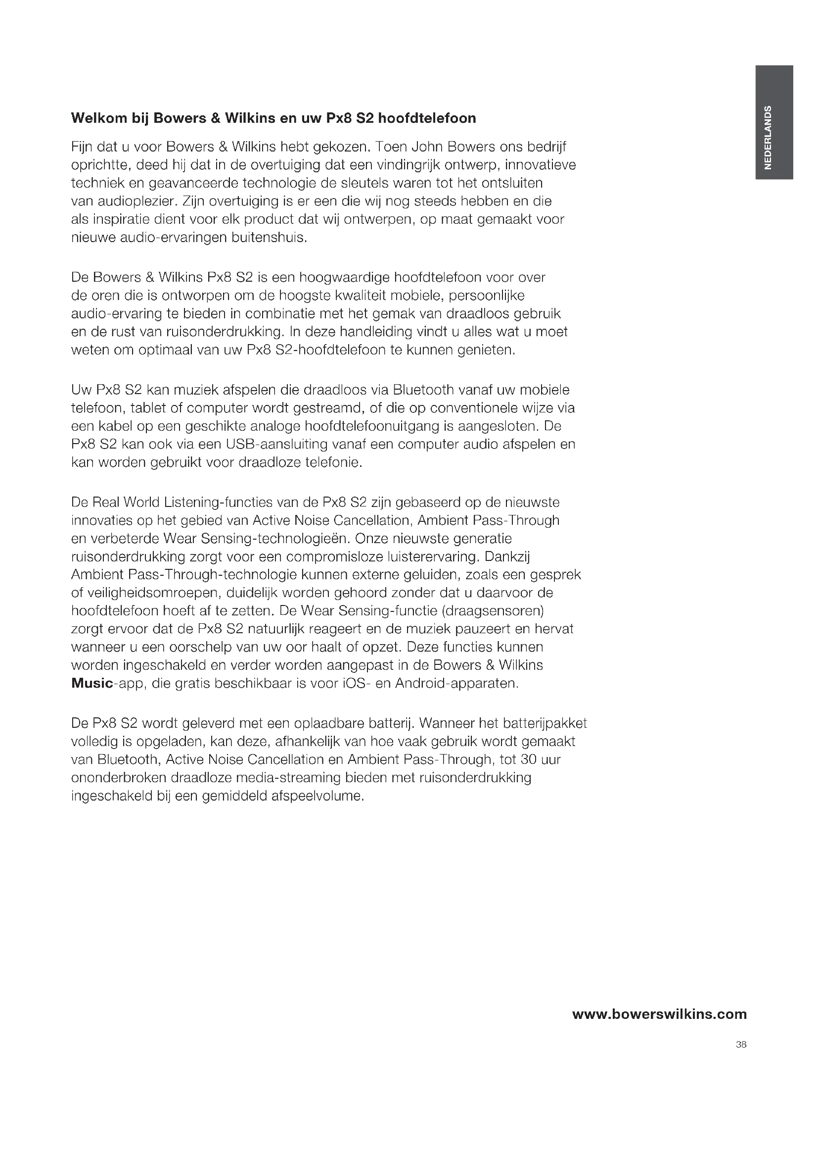Google Fast Pair Over-ear brusreducerande hörlurar aptX Lossless aptX Adaptive aptX HD aptX Classic AAC SBC 8 mikrofoner – 4 per öronkåpa ADI Pure Voice 2 × ø40mm dynamic full range carbon driver 30 timmar uppspelning 15 minuter laddning för 7 timmar uppspelning 1,2m USB-C till 3,5mm stereo audiokabel 1,2m USB-C till USB-C-kabel Bärväska 0,31kg 177 mm (b) × 60 mm (d) × 234 mm (h) Onyx Black Warm Stone www.bowerswilkins.com38 NEDERLANDS www.bowerswilkins.com Welkom bij Bowers & Wilkins en uw Px8 S2 hoofdtelefoon Fijn dat u voor Bowers & Wilkins hebt gekozen. Toen John Bowers ons bedrijf oprichtte, deed hij dat in de overtuiging dat een vindingrijk ontwerp, innovatieve techniek en geavanceerde technologie de sleutels waren tot het ontsluiten van audioplezier. Zijn overtuiging is er een die wij nog steeds hebben en die als inspiratie dient voor elk product dat wij ontwerpen, op maat gemaakt voor nieuwe audio-ervaringen buitenshuis.