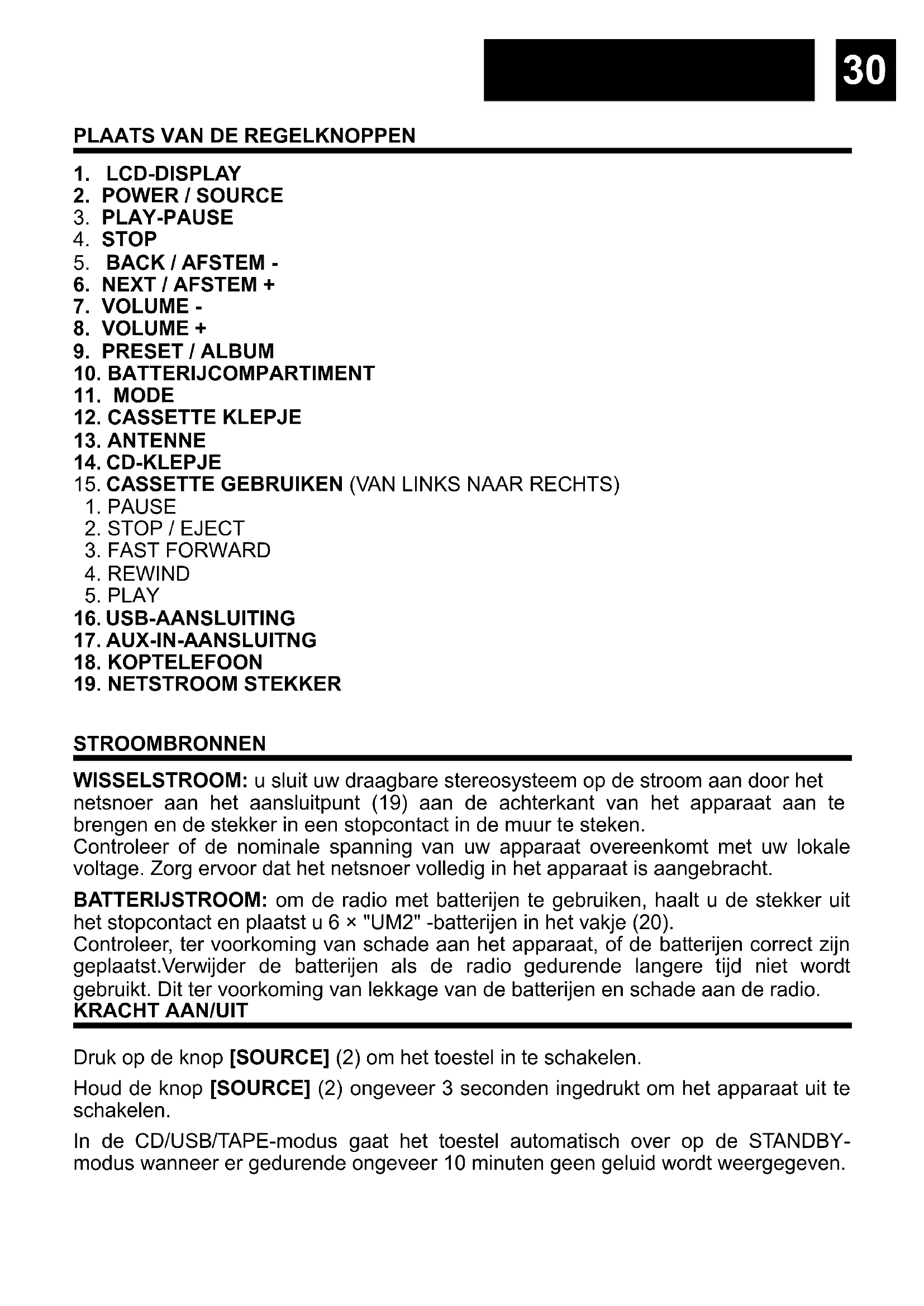 STROOMBRONNEN WISSELSTROOM: u sluit uw draagbare stereosysteem op de stroom aan door het netsnoer aan het aansluitpunt (19) aan de achterkant van het apparaat aan te brengen en de stekker in een stopcontact in de muur te steken. Controleer of de nominale spanning van uw apparaat overeenkomt met uw lokale voltage. Zorg ervoor dat het netsnoer volledig in het apparaat is aangebracht. BATTERIJSTROOM: om de radio met batterijen te gebruiken, haalt u de stekker uit het stopcontact en plaatst u 6 × "UM2" -batterijen in het vakje (20). Controleer, ter voorkoming van schade aan het apparaat, of de batterijen correct zijn geplaatst.Verwijder de batterijen als de radio gedurende langere tijd niet wordt gebruikt. Dit ter voorkoming van lekkage van de batterijen en schade aan de radio.