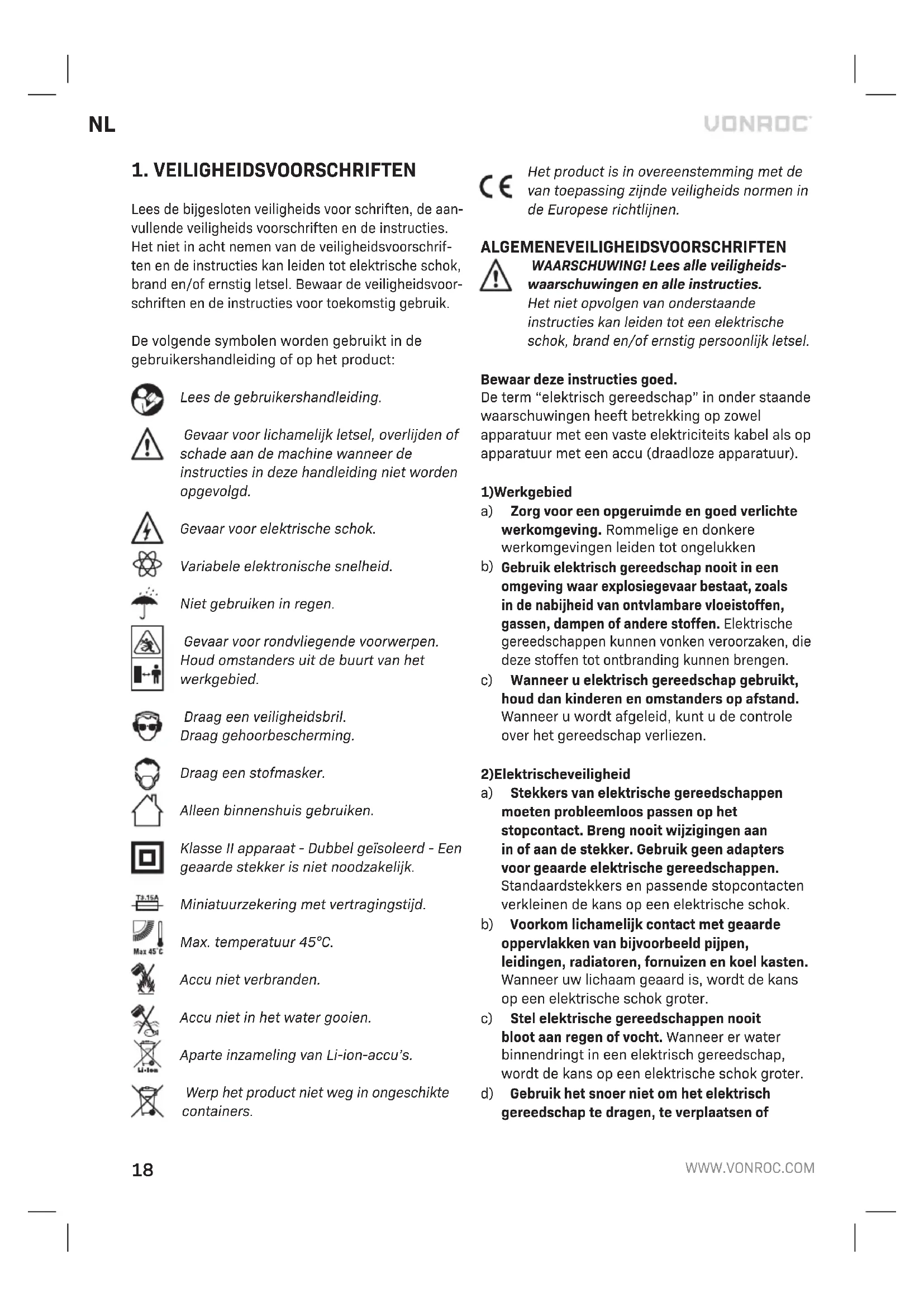 - Er zijn niet-originele reserveonderdelen gebruikt. Dit vormt de enige garantie opgesteld door het be- drijf zowel expliciet als impliciet. Er bestaan geen andere garanties expliciet of impliciet welke verder gaan dan deze garantie, inclusief impliciete garanties van verkoopbaarheid en geschiktheid voor bepaalde doeleinden. In geen enkel geval kan VONROC aansprakelijk worden gesteld voor incidentele schade of gevolgschade. Reparaties van dealers zijn gelimiteerd tot de reparatie of ver- vanging van defecte producten of onderdelen. Het product en de gebruikershandleiding zijn onderhevig aan wijzigingen. Specificaties kunnen zonder opgaaf van redenen worden gewijzigd.