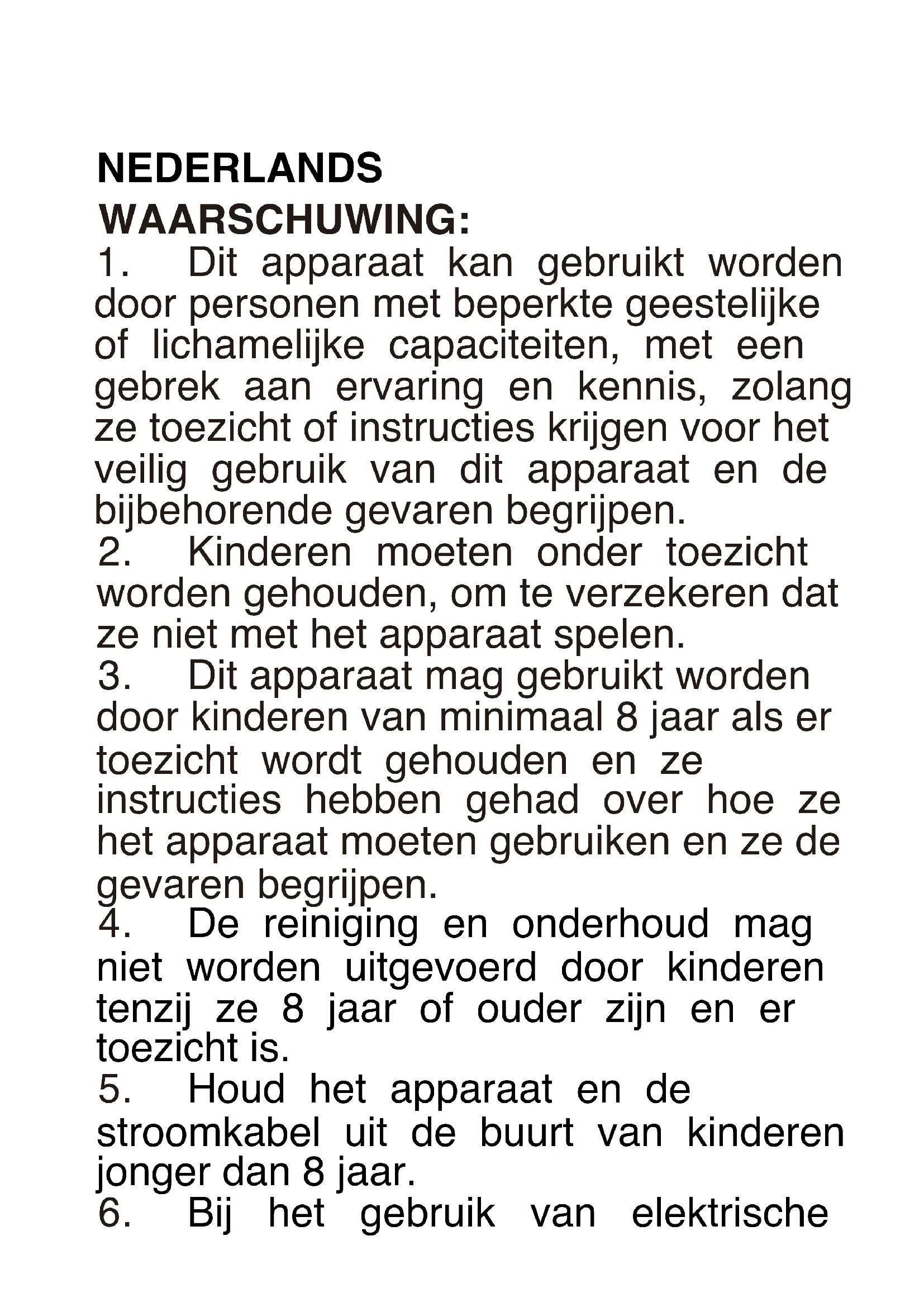 Dit apparaat mag gebruikt worden door kinderen van minimaal 8 jaar als er toezicht wordt gehouden en ze instructies hebben gehad over hoe ze het apparaat moeten gebruiken en ze de gevaren begrijpen.