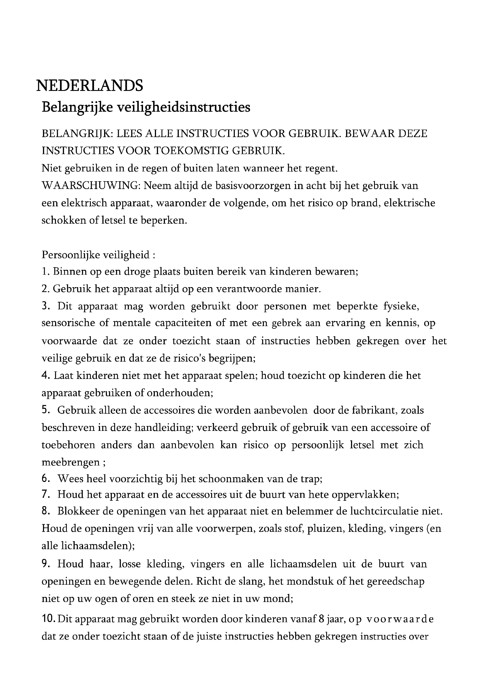 Adeva SAS / H.Koenig Europe - 8 rue Marc Seguin, 77290 Mitry-Mory, France www.hkoenig.com - https://kundenservice.hkoenig.com - Tél: +33 1 64 67 00 0NEDERLANDS Belangrijke veiligheidsinstructies BELANGRIJK: LEES ALLE INSTRUCTIES VOOR GEBRUIK. BEWAAR DEZE INSTRUCTIES VOOR TOEKOMSTIG GEBRUIK. Niet gebruiken in de regen of buiten laten wanneer het regent. WAARSCHUWING: Neem altijd de basisvoorzorgen in acht bij het gebruik van een elektrisch apparaat, waaronder de volgende, om het risico op brand, elektrische schokken of letsel te beperken. Persoonlijke veiligheid :