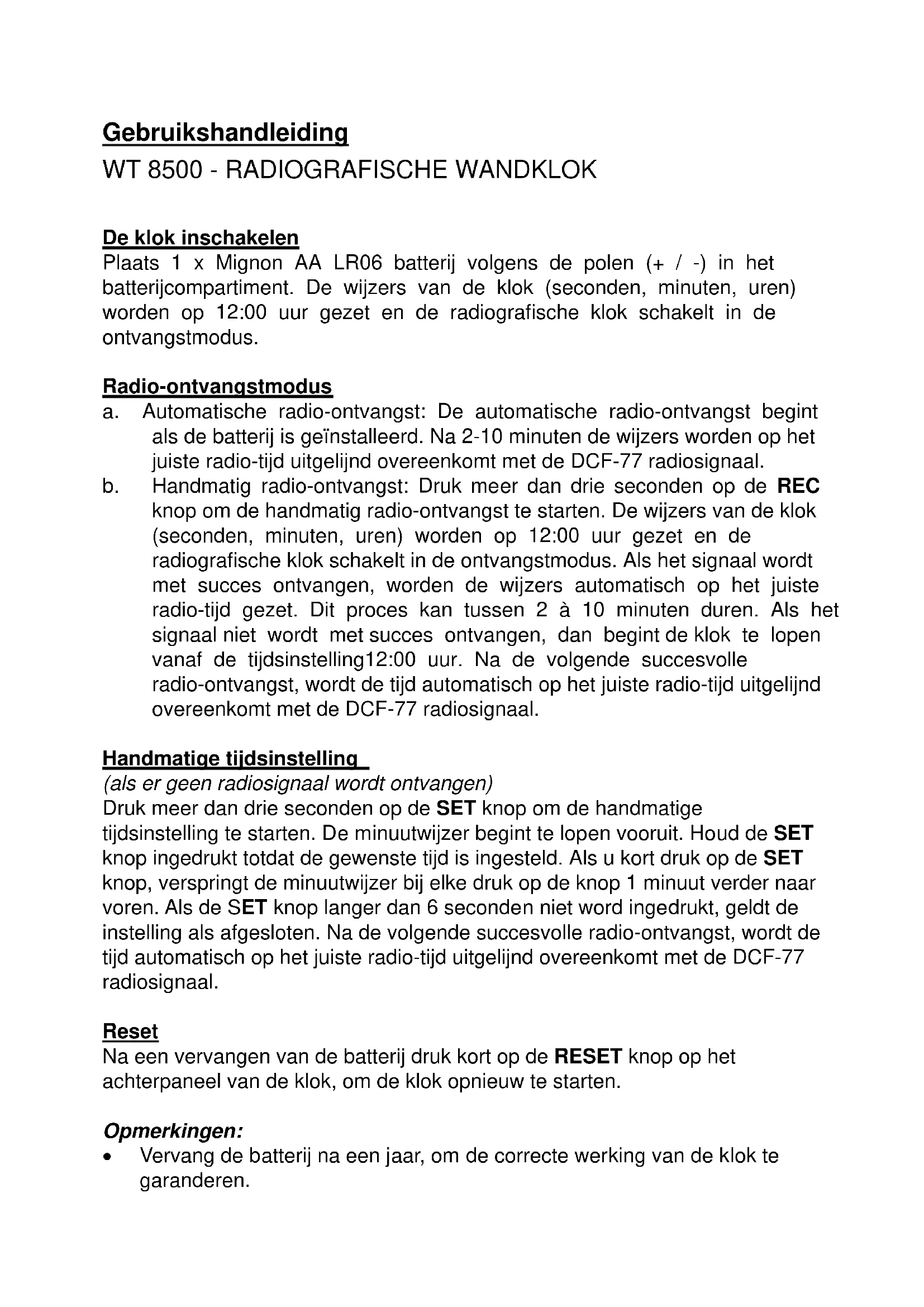 De klok inschakelen Plaats 1 x Mignon AA LR06 batterij volgens de polen (+ / -) in het batterijcompartiment. De wijzers van de klok (seconden, minuten, uren) worden op 12:00 uur gezet en de radiografische klok schakelt in de ontvangstmodus. Radio-ontvangstmodus a. Automatische radio-ontvangst: De automatische radio-ontvangst begint als de batterij is geïnstalleerd. Na 2-10 minuten de wijzers worden op het juiste radio-tijd uitgelijnd overeenkomt met de DCF-77 radiosignaal. b. Handmatig radio-ontvangst: Druk meer dan drie seconden op de REC knop om de handmatig radio-ontvangst te starten. De wijzers van de klok (seconden, minuten, uren) worden op 12:00 uur gezet en de radiografische klok schakelt in de ontvangstmodus. Als het signaal wordt met succes ontvangen, worden de wijzers automatisch op het juiste radio-tijd gezet. Dit proces kan tussen 2 à 10 minuten duren. Als het signaal niet wordt met succes ontvangen, dan begint de klok te lopen vanaf de tijdsinstelling12:00 uur. Na de volgende succesvolle radio-ontvangst, wordt de tijd automatisch op het juiste radio-tijd uitgelijnd overeenkomt met de DCF-77 radiosignaal. Handmatige tijdsinstelling (als er geen radiosignaal wordt ontvangen) Druk meer dan drie seconden op de SET knop om de handmatige tijdsinstelling te starten. De minuutwijzer begint te lopen vooruit. Houd de SET knop ingedrukt totdat de gewenste tijd is ingesteld. Als u kort druk op de SET knop, verspringt de minuutwijzer bij elke druk op de knop 1 minuut verder naar voren. Als de SET knop langer dan 6 seconden niet word ingedrukt, geldt de instelling als afgesloten. Na de volgende succesvolle radio-ontvangst, wordt de tijd automatisch op het juiste radio-tijd uitgelijnd overeenkomt met de DCF-77 radiosignaal. Reset Na een vervangen van de batterij druk kort op de RESET knop op het achterpaneel van de klok, om de klok opnieuw te starten. Opmerkingen: Vervang de batterij na een jaar, om de correcte werking van de klok te garanderen. Onderhoud en reparaties mogen alleen uitgevoerd worden door een deskundige of een gespecialiseerde werkplaats. Als u vragen heeft die niet beantwoord zijn in deze handleiding, neem dan contact op met onze technische dienst of een andere specialist. Hierbij verklaart Technotrade dat het toestel WT 8500 in overeenstemming is met de essentiële eisen en de andere relevante bepalingen van richtlijn 2014/53/EU en ROHS 2011/65/EG. De oorspronkelijke EU-verklaring van overeenstemming is te vinden op: www.technoline.de/doc/4029665385006 Milieueffecten op radio-ontvangst Het klok behoudt de exacte tijd via draadloze technologie. Zoals met alle draadloze apparatuur kan de ontvangstkwaliteit in de volgende omstandigheden worden aangetast: lange zendafstand in de buurt van bergen en valleien in de buurt van snelwegen, spoorwegen, vliegvelden, hoogspanningskabels, enz. in de buurt van bouwterreinen in de buurt van hoge gebouwen binnenin betonnen gebouwen in de buurt van elektrische apparatuur (computers, TV’s, enz.) en metalen structuren binnenin bewegende voertuigen Plaats het klok op een locatie met een optimaal signaal, bijv. dicht bij een raam en uit de buurt van metalen oppervlaktes of elektrisache apparatuur. Vorrzorgsmaatregelen Stel het apparaat niet bloot aan overmatige krachten of schokken. Stel het apparaat niet bloot aan hoge temperaturen, direct zonlicht, stof en vocht. Niet onderdompelen het apparaat in water Vermijd contact met bijtende stoffen. Gebruik het apparaat niet in een vuur. Deze kan ontploffen. Niet open de behuizing en niet manipuleren structurele componenten van het apparaat. Batterijvoorschriften Gebruik uitsluitend alkaline batterijen, geen oplaadbare batterijen. Installeer batterijen correct volgens de polariteitmarkeringen (+/-). Vervang altijd een volledige set batterijen. Combineer nooit gebruikte en nieuwe batterijen. Verwijder onmiddellijk uitgeputte batterijen. Verwijder batterijen wanneer niet in gebruik. Batterijen nooit opladen of in vuur werpen om ontploffing te voorkomen. Houd de batterijen niet in de nabijheid van metalen voorwerpen. Een contact kan een kortsluiting veroorzaken. Houd alle batterijen buiten bereik van kinderen omdat ze een verstikkingsgevaar vormen. Bewaar de verpakking voor eventueel toekomstig gebruik. Gebruik het product alleen voor het doel waarvoor deze bestemd! Verordening verwijdering batterijen Oude batterijen horen niet in het huisvuil. Als batterijen in het milieu terechtkomen kunnen deze milieu en gezondheidsproblemen tot gevolg hebben. U kunt gebruikte batterijen kosteloos bij uw handelaar of inzamelplaatsen teruggeven. U bent als verbruiker wettelijk verplicht oude batterijen, als omschreven, in te leveren. Verordening verwijdering elektrische apparaten Dit symbool betekent dat elektrische apparatuur, wanneer hij het eind van zijn levensduur bereikt, niet mag worden afgevoerd met het gewone huishoudelijk afval. Breng de apparaat naar het plaatselijke inzamelpunt voor afval of recyclingcentrum. Dit is van toepassing voor alle landen van de Europese Unie en op de overige Europese landen met een systeem voor gescheiden afvalinzameling.Manuale di istruzioni