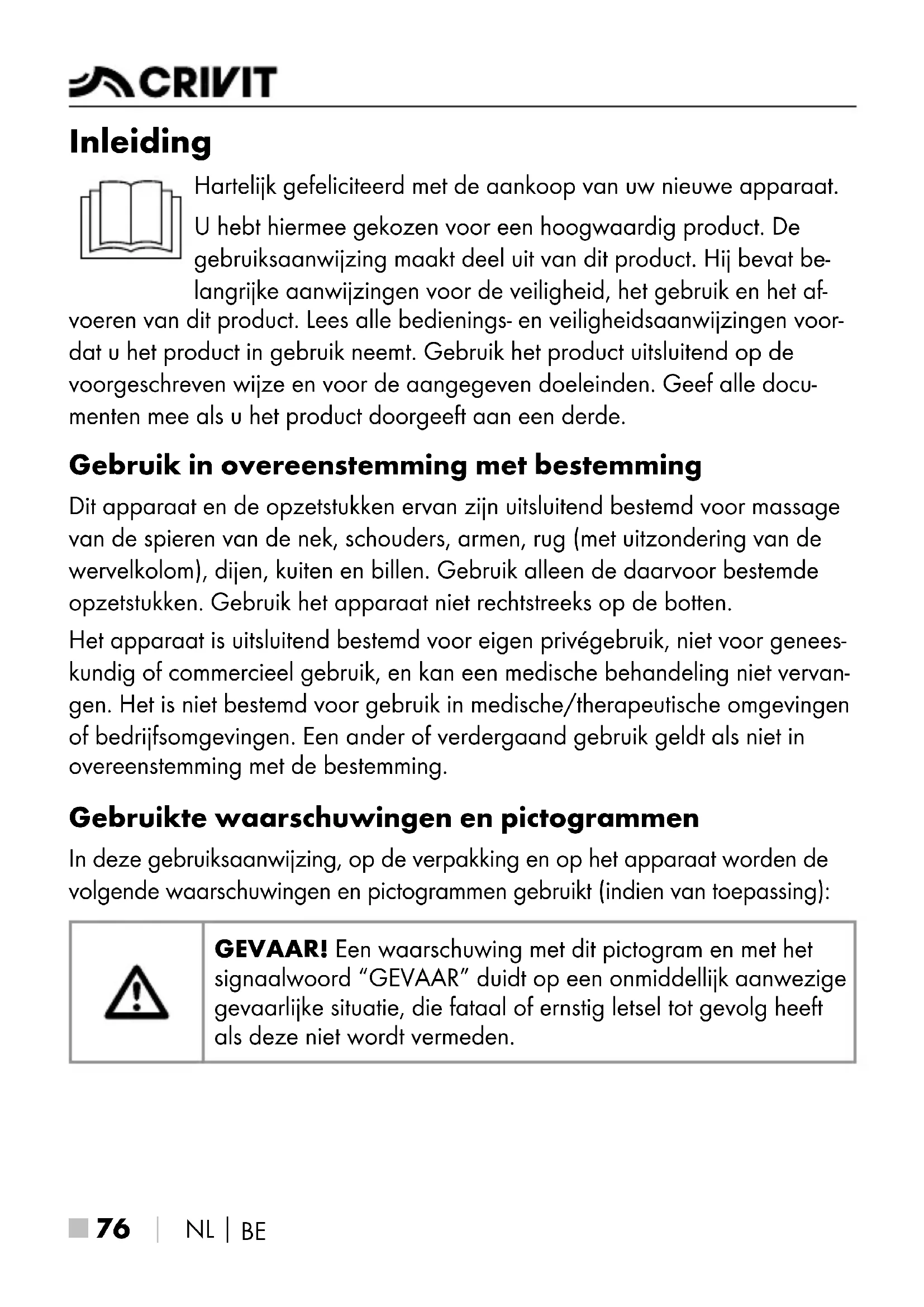 Inleiding Hartelijk gefeliciteerd met de aankoop van uw nieuwe apparaat. U hebt hiermee gekozen voor een hoogwaardig product. De gebruiksaanwijzing maakt deel uit van dit product. Hij bevat be- langrijke aanwijzingen voor de veiligheid, het gebruik en het af- voeren van dit product. Lees alle bedienings- en veiligheidsaanwijzingen voor- dat u het product in gebruik neemt. Gebruik het product uitsluitend op de voorgeschreven wijze en voor de aangegeven doeleinden. Geef alle docu- menten mee als u het product doorgeeft aan een derde. Gebruik in overeenstemming met bestemming Dit apparaat en de opzetstukken ervan zijn uitsluitend bestemd voor massage van de spieren van de nek, schouders, armen, rug (met uitzondering van de wervelkolom), dijen, kuiten en billen. Gebruik alleen de daarvoor bestemde opzetstukken. Gebruik het apparaat niet rechtstreeks op de botten. Het apparaat is uitsluitend bestemd voor eigen privégebruik, niet voor genees- kundig of commercieel gebruik, en kan een medische behandeling niet vervan- gen. Het is niet bestemd voor gebruik in medische/therapeutische omgevingen of bedrijfsomgevingen. Een ander of verdergaand gebruik geldt als niet in overeenstemming met de bestemming. Gebruikte waarschuwingen en pictogrammen In deze gebruiksaanwijzing, op de verpakking en op het apparaat worden de volgende waarschuwingen en pictogrammen gebruikt (indien van toepassing): GEVAAR! Een waarschuwing met dit pictogram en met het signaalwoord “GEVAAR” duidt op een onmiddellijk aanwezige gevaarlijke situatie, die fataal of ernstig letsel tot gevolg heeft als deze niet wordt vermeden. IB_479864_2410_CMMG3.7A1_LB8.indb 76 27.01.2025 07:52:58NL