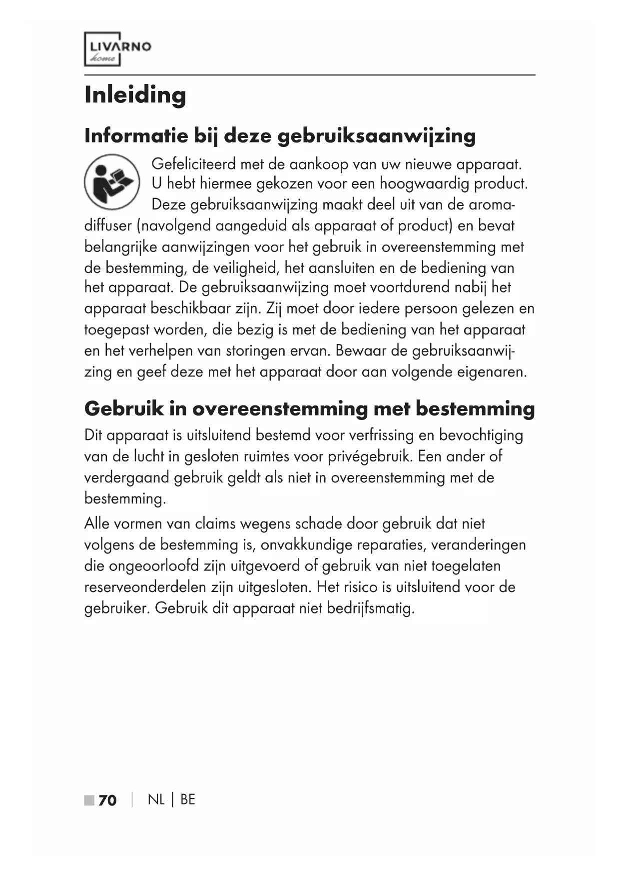 Inleiding Informatie bij deze gebruiksaanwijzing Gefeliciteerd met de aankoop van uw nieuwe apparaat. Uhebt hiermee gekozen voor een hoogwaardig product. Deze gebruiksaanwijzing maakt deel uit van de aroma- diffuser (navolgend aangeduid als apparaat of product) en bevat belangrijke aanwijzingen voor het gebruik in overeenstemming met de bestemming, de veiligheid, het aansluiten en de bediening van het apparaat. De gebruiksaanwijzing moet voortdurend nabij het apparaat beschikbaar zijn. Zij moet door iedere persoon gelezen en toegepast worden, die bezig is met de bediening van het apparaat en het verhelpen van storingen ervan. Bewaar de gebruiksaanwij- zing en geef deze met het apparaat door aan volgende eigenaren. Gebruik in overeenstemming met bestemming Dit apparaat is uitsluitend bestemd voor verfrissing en bevochtiging van de lucht in gesloten ruimtes voor privégebruik. Een ander of verdergaand gebruik geldt als niet in overeenstemming met de bestemming. Alle vormen van claims wegens schade door gebruik dat niet volgens de bestemming is, onvakkundige reparaties, veranderingen die ongeoorloofd zijn uitgevoerd of gebruik van niet toegelaten reserveonderdelen zijn uitgesloten. Het risico is uitsluitend voor de gebruiker. Gebruik dit apparaat niet bedrijfsmatig. IB_481062_2410_LADG12A1_LADV12A1_LB8.indb 70 14.03.2025 10:49:52NL