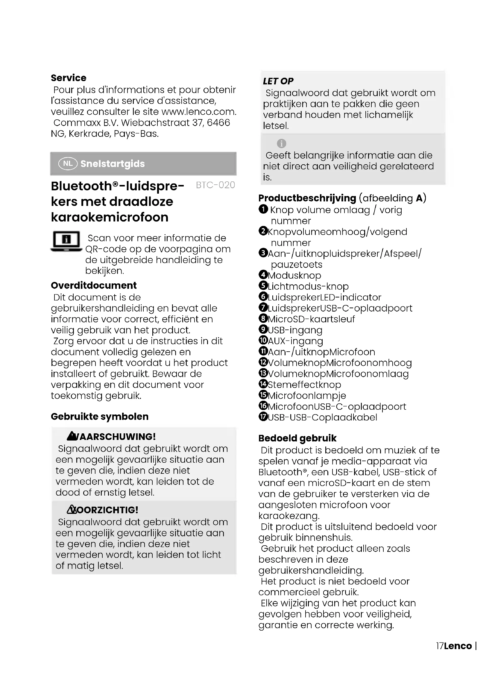USB - USB-C oplaadkabel Bedoeld gebruik Dit product is bedoeld om muziek af te spelen vanaf je media-apparaat via Bluetooth®, een USB-kabel, USB-stick of vanaf een microSD-kaart en de stem van de gebruiker te versterken via de aangesloten microfoon voor karaokezang. Dit product is uitsluitend bedoeld voor gebruik binnenshuis. Gebruik het product alleen zoals beschreven in deze gebruikershandleiding. Het product is niet bedoeld voor commercieel gebruik. Elke wijziging van het product kan gevolgen hebben voor veiligheid, garantie en correcte werking. Service Pour plus d'informations et pour obtenir l'assistance du service d'assistance, veuillez consulter le site www.lenco.com. Commaxx B.V. Wiebachstraat 37, 6466 NG, Kerkrade, Pays-Bas.