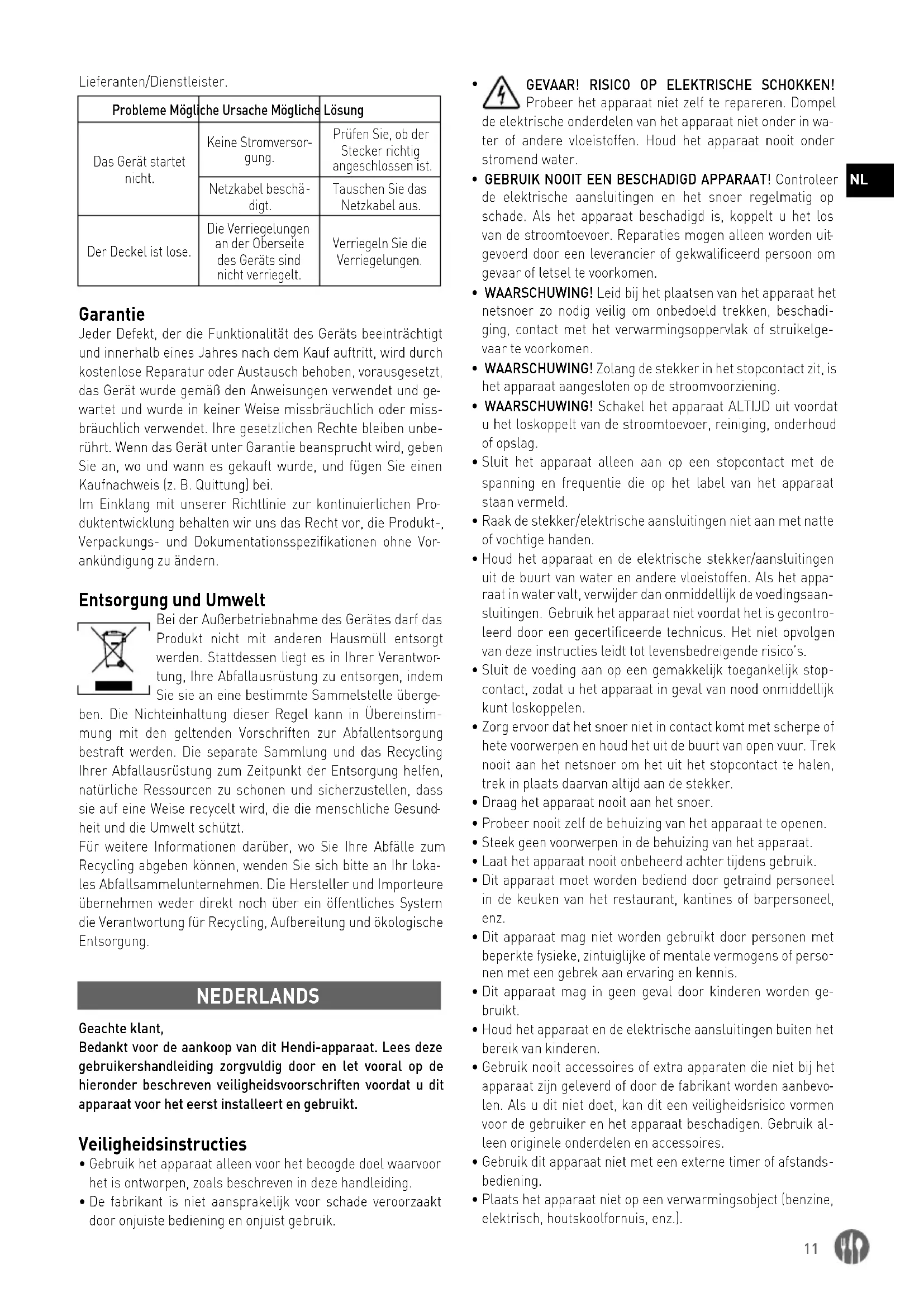 les Abfallsammelunternehmen. Die Hersteller und Importeure übernehmen weder direkt noch über ein öffentliches System die Verantwortung für Recycling, Aufbereitung und ökologische Entsorgung. NEDERLANDS Geachte klant, Bedankt voor de aankoop van dit Hendi-apparaat. Lees deze gebruikershandleiding zorgvuldig door en let vooral op de hieronder beschreven veiligheidsvoorschriften voordat u dit apparaat voor het eerst installeert en gebruikt. Veiligheidsinstructies