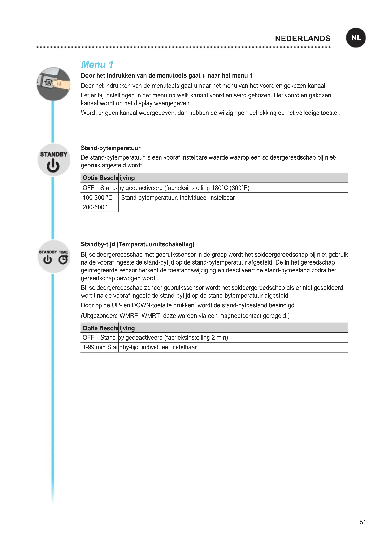 PORTUGUES51 Menu 1 Door het indrukken van de menutoets gaat u naar het menu 1 Doorhetindrukkenvandemenutoetsgaatunaarhetmenuvanhetvoordiengekozenkanaal. Leterbijinstellingeninhetmenuopwelkkanaalvoordienwerdgekozen.Hetvoordiengekozen kanaalwordtophetdisplayweergegeven. Wordtergeenkanaalweergegeven,danhebbendewijzigingenbetrekkingophetvolledigetoestel. Stand-bytemperatuur Destand-bytemperatuuriseenvoorafinstelbarewaardewaaropeensoldeergereedschapbijniet- gebruikafgesteldwordt. Optie Beschrijving OFF Stand-bygedeactiveerd(fabrieksinstelling180°C(360°F) 100-300°C 200-600°F Stand-bytemperatuur,individueelinstelbaar Standby-tijd (Temperatuuruitschakeling) Bijsoldeergereedschapmetgebruikssensorindegreepwordthetsoldeergereedschapbijniet-gebruik nadevoorafingesteldestand-bytijdopdestand-bytemperatuurafgesteld.Deinhetgereedschap geïntegreerdesensorherkentdetoestandswijzigingendeactiveertdestand-bytoestandzodrahet gereedschapbewogenwordt. Bijsoldeergereedschapzondergebruikssensorwordthetsoldeergereedschapalsernietgesoldeerd wordtnadevoorafingesteldestand-bytijdopdestand-bytemperatuurafgesteld. DooropdeUP-enDOWN-toetstedrukken,wordtdestand-bytoestandbeëindigd. (UitgezonderdWMRP,WMRT,dezewordenviaeenmagneetcontactgeregeld.) Optie Beschrijving OFF Stand-bygedeactiveerd(fabrieksinstelling2min) 1-99 min Standby-tijd,individueelinstelbaar