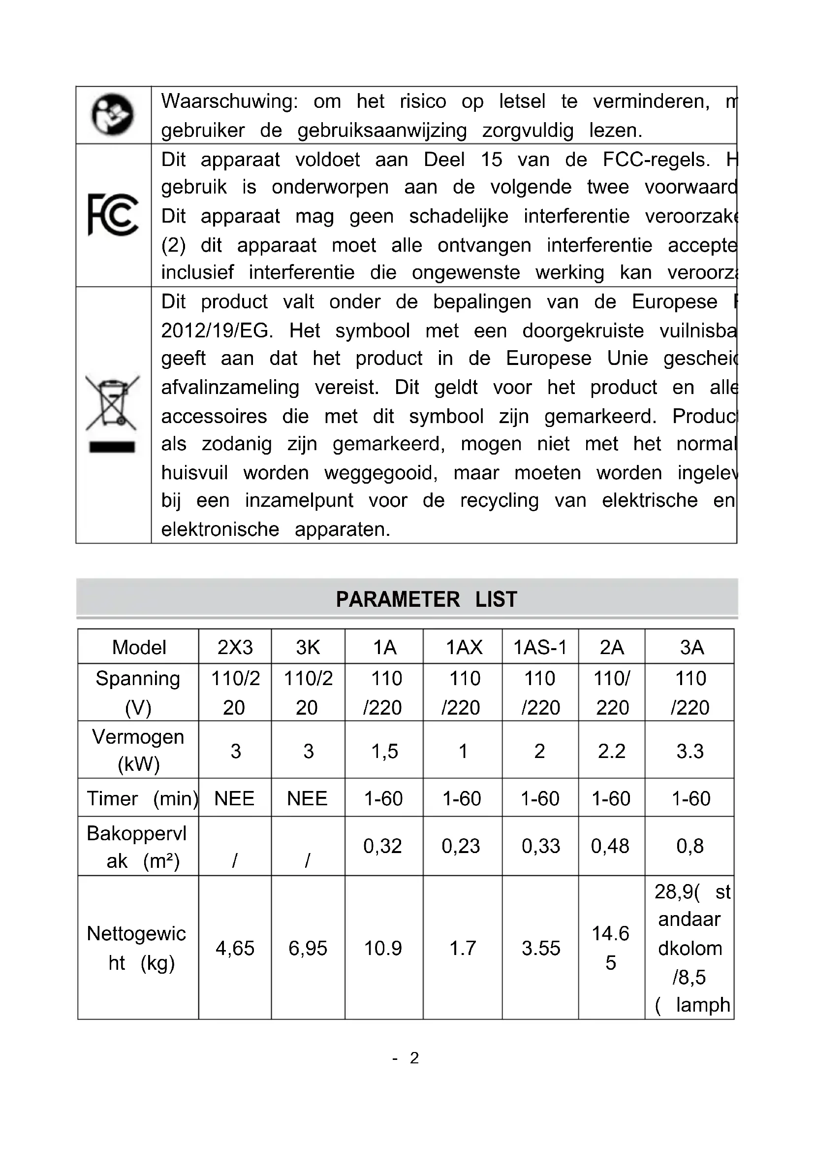 SHUNSHUN GmbH Römeräcker 9 Z2021,76351 Linkenheim-Hochstetten, Germany euvertreter@gmail.com +49 1727041930- 23 -Techniczny Certyfikat wsparcia i gwarancji elektronicznej www.vevor.com/supportTechnisch Ondersteuning en e-garantiecertificaat www.vevor.com/support INFRAROOD VERFLAMP MODEL: 2X3, 3K, 1A, 1AX, 1AS-1, 2A, 3A We continue to be committed to provide you tools with competitive price. "Save Half", "Half Price" or any other similar expressions used by us only represents an estimate of savings you might benefit from buying certain tools with us compared to the major top brands and does not necessarily mean to cover all categories of tools offered by us. You are kindly reminded to verify carefully when you are placing an order with us if you are actually saving half in comparison with the top major brands.- 1 - MODEL: 2X3, 3K, 1A, 1AX, 1AS-1, 2A, 3A Have product questions? Need technical support? Please feel free to contact us: Technical Support and E-Warranty Certificate www.vevor.com/support NEED HELP? CONTACT US! This is the original instruction, please read all manual instructions carefully before operating. VEVOR reserves a clear interpretation of our user manual. The appearance of the product shall be subject to the product you received. Please forgive us that we won't inform you again if there are any technology or software updates on our product. Infrared Paint Lamp- 2 - Waarschuwing: om het risico op letsel te verminderen, moet de gebruiker de gebruiksaanwijzing zorgvuldig lezen. Dit apparaat voldoet aan Deel 15 van de FCC-regels. Het gebruik is onderworpen aan de volgende twee voorwaarden: (1) Dit apparaat mag geen schadelijke interferentie veroorzaken, en (2) dit apparaat moet alle ontvangen interferentie accepteren, inclusief interferentie die ongewenste werking kan veroorzaken. Dit product valt onder de bepalingen van de Europese Richtlijn 2012/19/EG. Het symbool met een doorgekruiste vuilnisbak geeft aan dat het product in de Europese Unie gescheiden afvalinzameling vereist. Dit geldt voor het product en alle accessoires die met dit symbool zijn gemarkeerd. Producten die als zodanig zijn gemarkeerd, mogen niet met het normale huisvuil worden weggegooid, maar moeten worden ingeleverd bij een inzamelpunt voor de recycling van elektrische en elektronische apparaten. PARAMETER LIST Model 2X3