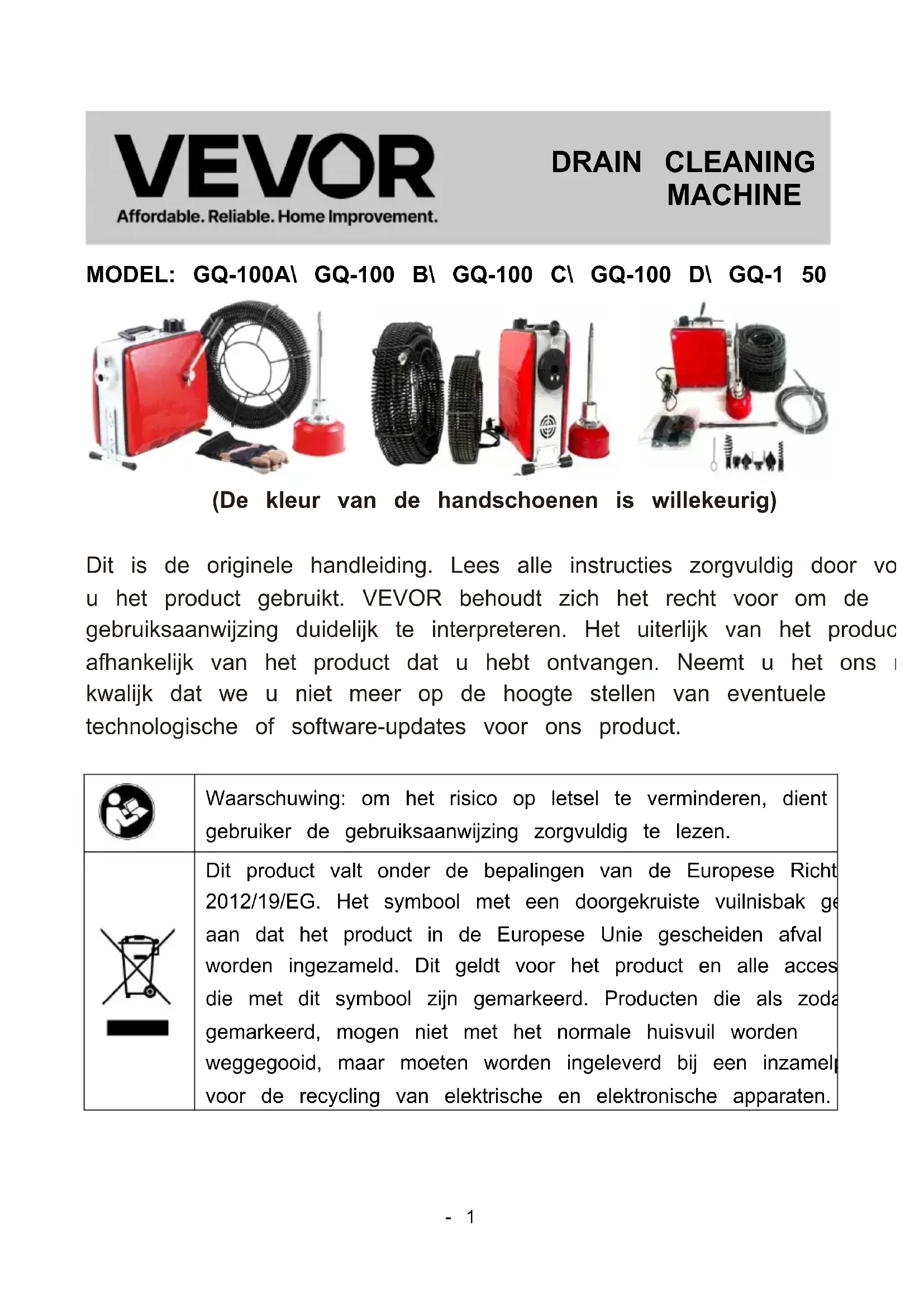 GQ- 100B GQ-100 C GQ- 100D GQ-150- 1 - MODEL: GQ-100A\ GQ-100 B\ GQ-100 C\ GQ-100 D\ GQ-1 50 (De kleur van de handschoenen is willekeurig) Dit is de originele handleiding. Lees alle instructies zorgvuldig door voordat u het product gebruikt. VEVOR behoudt zich het recht voor om de gebruiksaanwijzing duidelijk te interpreteren. Het uiterlijk van het product is afhankelijk van het product dat u hebt ontvangen. Neemt u het ons niet kwalijk dat we u niet meer op de hoogte stellen van eventuele technologische of software-updates voor ons product. Waarschuwing: om het risico op letsel te verminderen, dient de gebruiker de gebruiksaanwijzing zorgvuldig te lezen. Dit product valt onder de bepalingen van de Europese Richtlijn 2012/19/EG. Het symbool met een doorgekruiste vuilnisbak geeft aan dat het product in de Europese Unie gescheiden afval moet worden ingezameld. Dit geldt voor het product en alle accessoires die met dit symbool zijn gemarkeerd. Producten die als zodanig zijn gemarkeerd, mogen niet met het normale huisvuil worden weggegooid, maar moeten worden ingeleverd bij een inzamelpunt voor de recycling van elektrische en elektronische apparaten. DRAIN CLEANING MACHINE- 2 - Dit symbool geeft aan dat u bij gebruik van de machine altijd een veiligheidsbril met beschermplaten en oogbeschermingsfuncties moet dragen om het risico op oogletsel te verminderen. Dit symbool waarschuwt voor het gevaar dat handen, vingers of andere lichaamsdelen bekneld raken in de kabel van de baggermachine. Het symbool geeft aan dat er gevaar bestaat als u bij de riem of de poelie betrokken raakt. Het symbool geeft aan dat er gevaar bestaat voor een elektrische schok. INSTRUCTIES Veiligheidsinstructie Lees alle veiligheidsmaatregelen en -instructies zorgvuldig door. Het niet opvolgen van deze veiligheidsinstructies kan leiden tot schokken, brand of ernstig letsel. Bewaar deze veiligheidsmaatregelen en -instructies zorgvuldig. Veiligheidsmaatregelen op de werkplek