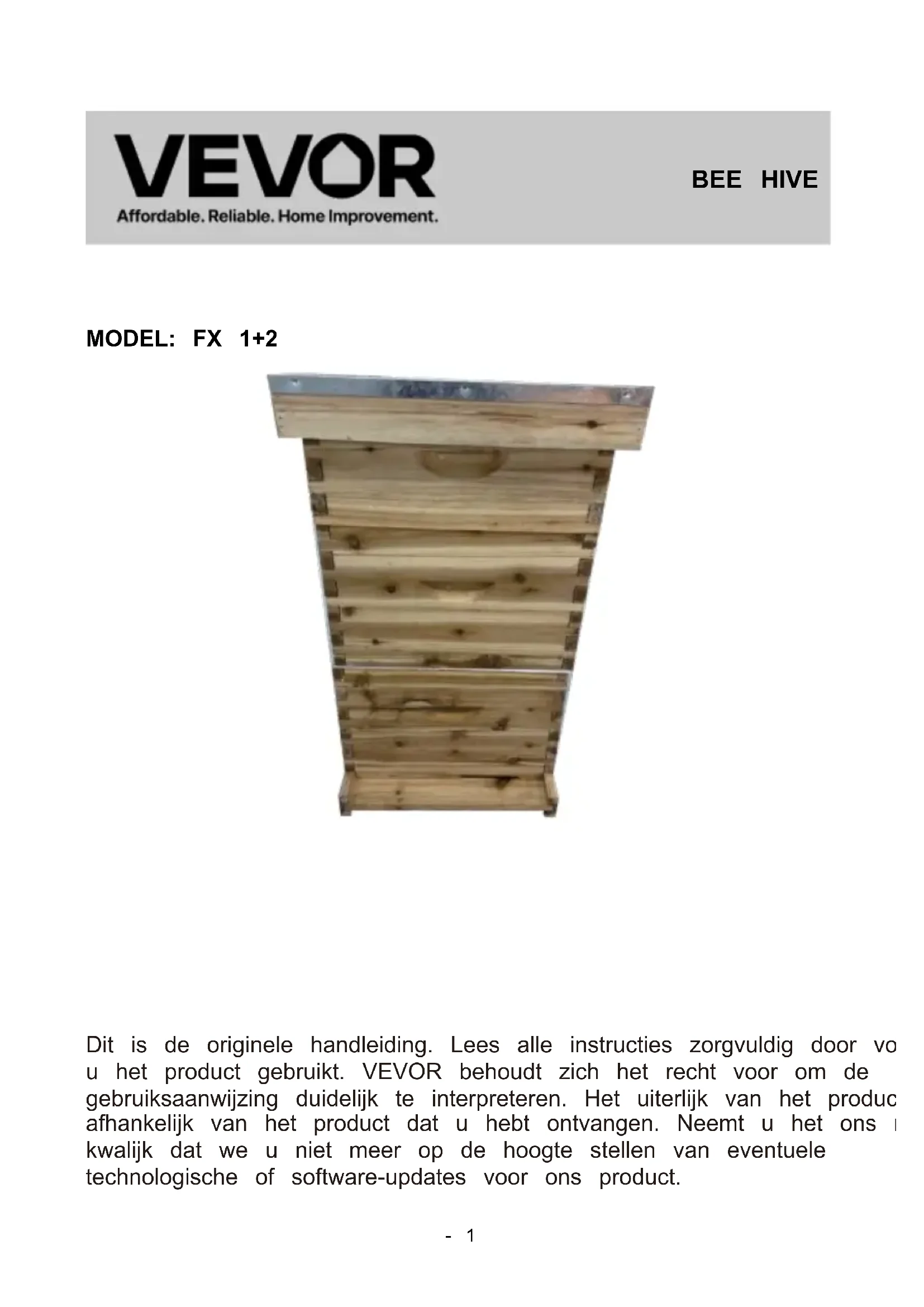 MODEL: FX 1+2 Dit is de originele handleiding. Lees alle instructies zorgvuldig door voordat u het product gebruikt. VEVOR behoudt zich het recht voor om de gebruiksaanwijzing duidelijk te interpreteren. Het uiterlijk van het product is afhankelijk van het product dat u hebt ontvangen. Neemt u het ons niet kwalijk dat we u niet meer op de hoogte stellen van eventuele technologische of software-updates voor ons product. BEE HIVE- 2 - Waarschuwing: om het risico op letsel te verminderen, moet de gebruiker de gebruiksaanwijzing zorgvuldig lezen. INSTALLATION NOTES OPMERKINGEN :