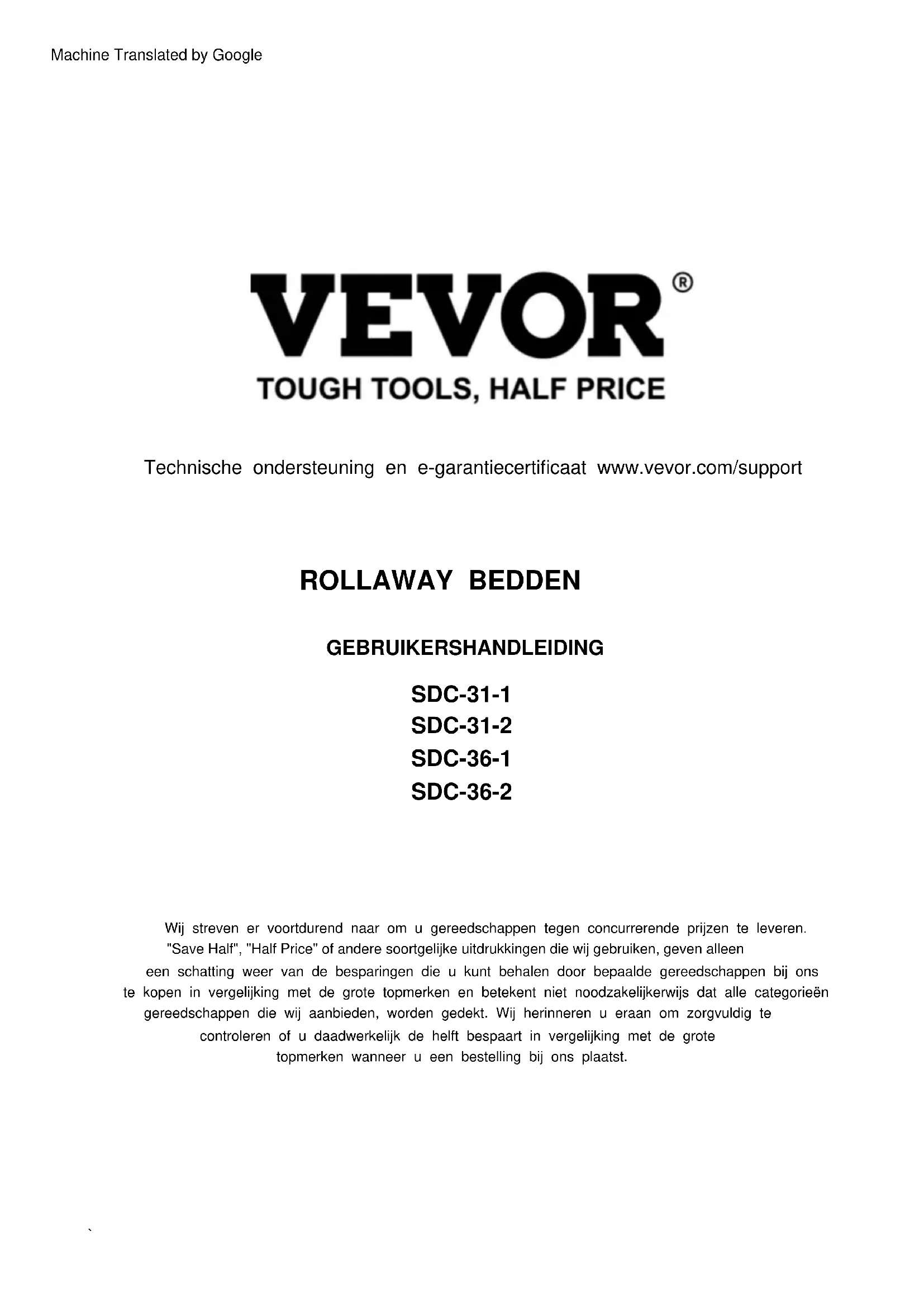 Machine Translated by GoogleTechnische ondersteuning en e- garantiecertificaat www.vevor.com/support Heeft u vragen over het product? Heeft u technische ondersteuning nodig? Neem dan gerust contact met ons op: MODEL:SDC-31-1 SDC-31-2 SDC-36-1 SDC-36-2 Dit is de originele instructie, lees alle handleidingen zorgvuldig door voordat u het product gebruikt. VEVOR behoudt zich een duidelijke interpretatie van onze gebruikershandleiding voor. Het uiterlijk van het product is afhankelijk van het product dat u hebt ontvangen. Vergeef ons dat we u niet opnieuw zullen informeren als er technologie- of software-updates voor ons product zijn. HULP NODIG? NEEM CONTACT MET ONS OP! ROLLAWAY BEDDEN