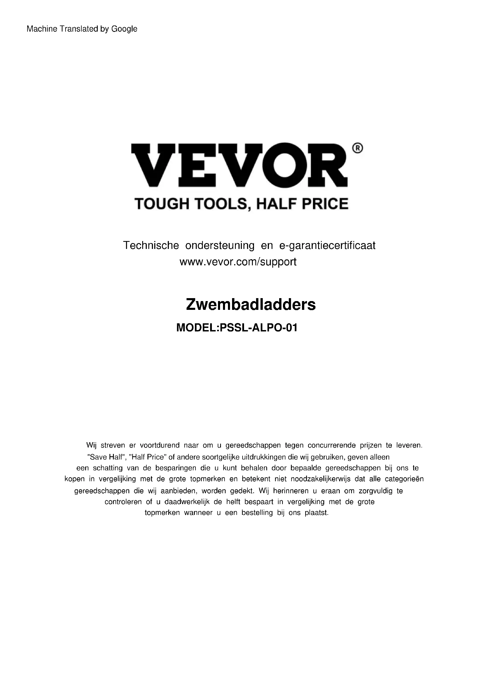 Machine Translated by GoogleWsparcie techniczne i certyfikat gwarancji elektronicznej www.vevor.com/support Machine Translated by GoogleZwembadladders MODEL:PSSL-ALPO-01 Technische ondersteuning en e-garantiecertificaat www.vevor.com/support "Save Half", "Half Price" of andere soortgelijke uitdrukkingen die wij gebruiken, geven alleen een schatting van de besparingen die u kunt behalen door bepaalde gereedschappen bij ons te kopen in vergelijking met de grote topmerken en betekent niet noodzakelijkerwijs dat alle categorieën gereedschappen die wij aanbieden, worden gedekt. Wij herinneren u eraan om zorgvuldig te controleren of u daadwerkelijk de helft bespaart in vergelijking met de grote topmerken wanneer u een bestelling bij ons plaatst. Wij streven er voortdurend naar om u gereedschappen tegen concurrerende prijzen te leveren. Machine Translated by GoogleHULP NODIG? NEEM CONTACT MET ONS OP!