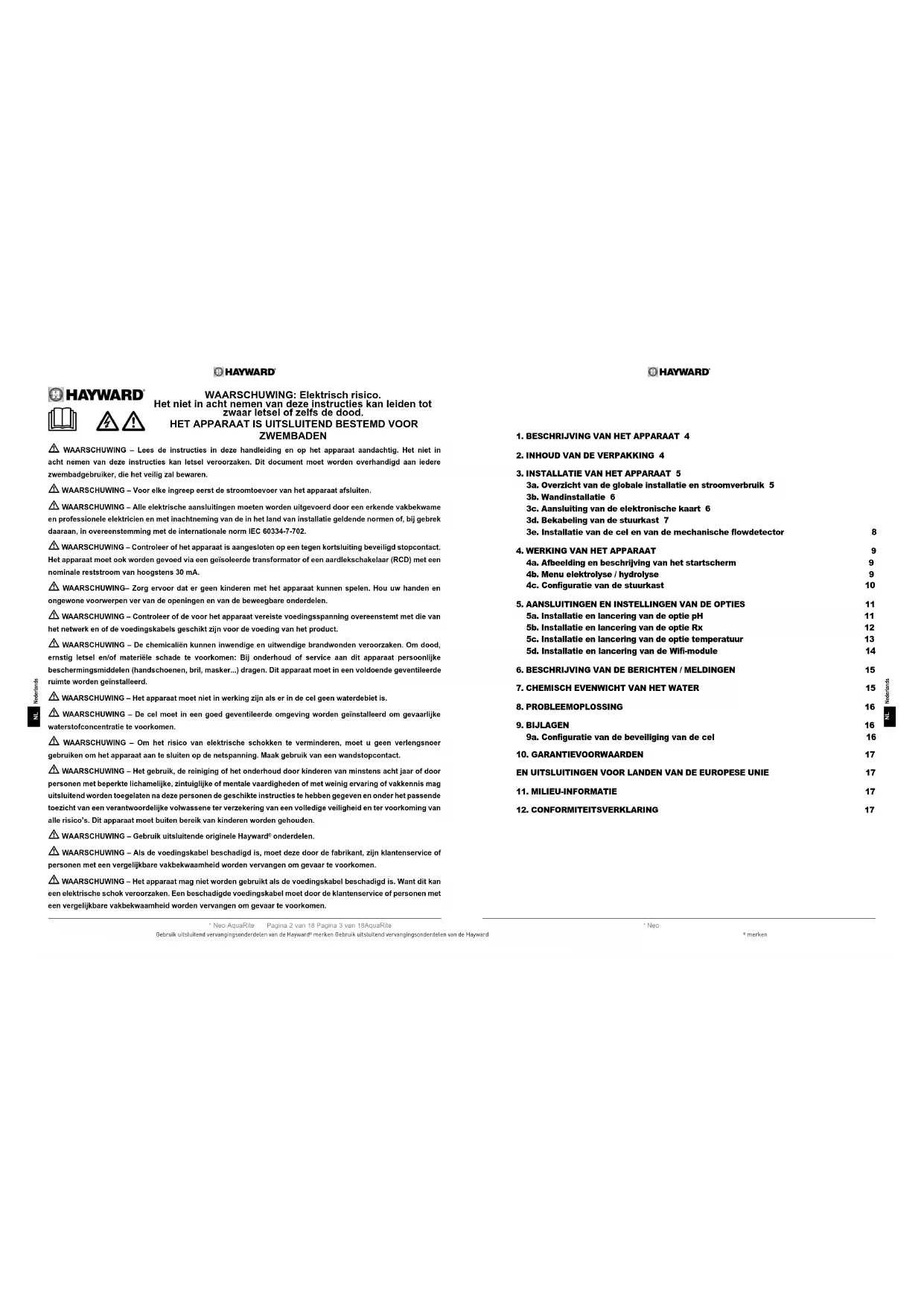 -onderdelen en -componenten bevatten. De garantie geldt niet voor schade die te wijten is aan vorst en chemicaliën. Alle andere kosten (transport, arbeidsloon, enz.) zijn uitgesloten van de garantie. HAYWARD kan niet aansprakelijk worden gesteld voor directe of indirecte schade die voortvloeit uit een verkeerde installatie, aansluiting of gebruik van het product. Om uw recht op garantie uit te oefenen en de reparatie of de vervanging van een product aan te vragen, moet u contact opnemen met uw leverancier. Geen enkel apparaat dat naar onze fabriek wordt teruggestuurd, zal worden aanvaard zonder onze voorafgaande schriftelijke toestemming. De garantie geldt niet voor slijtbare onderdelen. Het onderhoud van onderstaande slijtbare onderdelen van de zoutelektrolyse is nodig afhankelijk van hun geschatte levensduur: - Titaan cel: 8000 uur - Pakkingset (titaan cel, sondehouder): 2 jaar - Santoprene slang (peristaltische pomp) - Membraan (elektromagnetische pomp): 2 jaar - Sonde (pH, Rx, geleidbaarheid, vrij chloor): 1 jaar (garantie 6 maanden) Voorziening voor afgedankte elektrische en elektronische apparatuur van professionals. In overeenstemming met Richtlijn 2012/19/EU betreffende het beheer van afgedankte elektrische en elektronische apparatuur moet deze stuurkast naar een selectief inzamelpunt worden gebracht. ==> Voor meer informatie kunt u contact opnemen met uw distributeur. Goed beheer van elektrische en elektronische apparatuur helpt schade aan het milieu en de volksgezondheid te voorkomen. In overeenstemming met Verordening (EU) 2023/1542 van het Europees Parlement en de Raad van 12 juli 2023 inzake batterijen en afgedankte batterijen, tot wijziging van Richtlijn 2008/98/EG en Verordening (EU) 2019/2020 en tot intrekking van Richtlijn 2006/66/EG, geeft het symbool bij deze handleiding aan dat de in de stuurkast ingebouwde batterij apart moet worden ingezameld. Als de batterij het einde van zijn levensduur heeft bereikt, moet deze worden verwijderd en ingeleverd bij een selectief inzamelpunt. Op de vorige pagina ziet u hoe u de batterij vervangt. Dit product voldoet aan de volgende richtlijnen: - Laagspanningsrichtlijn 2014/35/EU, IEC 60335-1:2020, EN IEC 60335-1:2023+A11:2023, EN 62233:2008 + IPX4, - ECM-richtlijn 2014/30/EU, EN IEC55014-1:2021, EN IEC 55014-2:2021, EN IEC 61000-3-2:2019+A1:2021, EN 61000-3-3:2013+A1:2019+A2:2021+AC:2022-01. - RoHS 2011/65/EU - Wijziging (EU) 2015/863, Verordening (EU) 2024/1781 - WEEE. Overeenkomstig de EU-verordening 2023/988 inzake algemene productveiligheid, geeft Hayward
