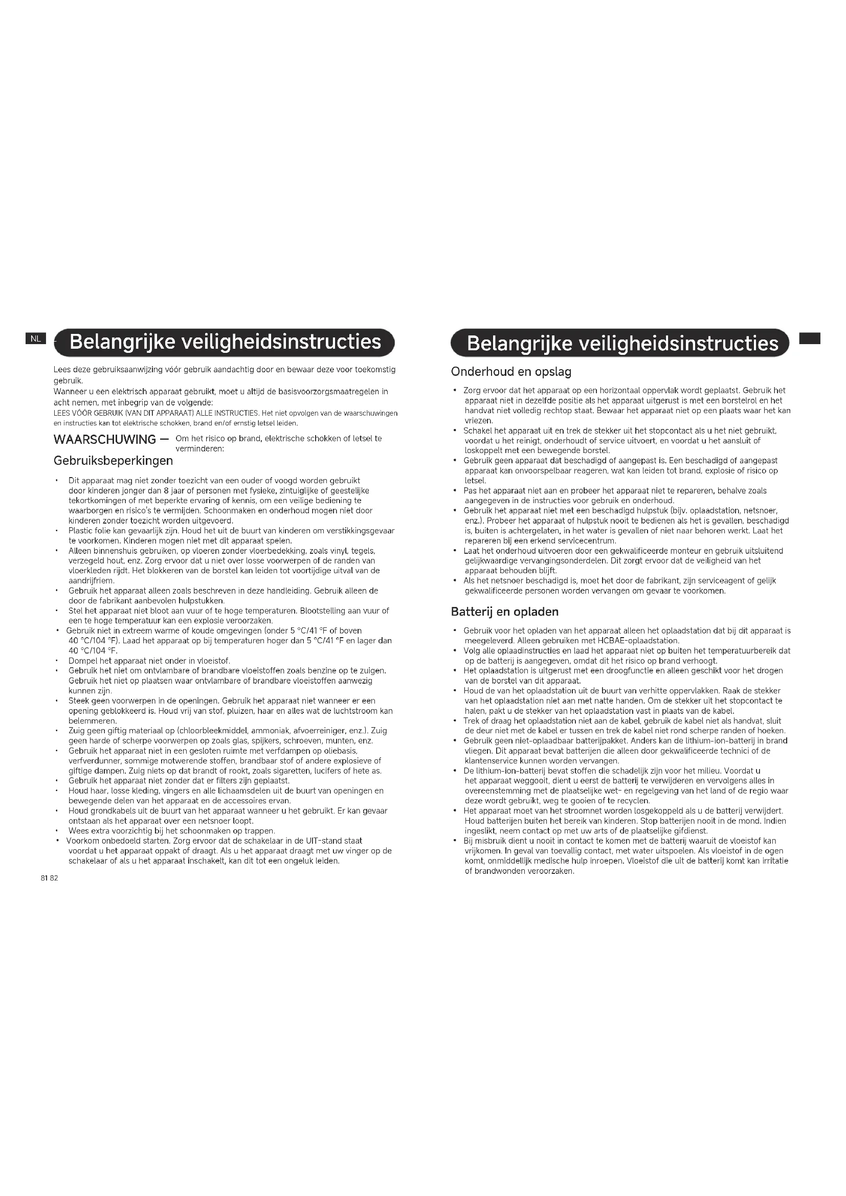 - Cuando el aparato esté totalmente cargado, accederá automáticamente al modo de espera pasados 10 minutos, con un consumo energético de 0,8W(con espera de red) o 0,4W(sin espera de red).81 82 NL NL Belangrijke veiligheidsinstructies Belangrijke veiligheidsinstructies Lees deze gebruiksaanwijzing vóór gebruik aandachtig door en bewaar deze voor toekomstig gebruik. Wanneer u een elektrisch apparaat gebruikt, moet u altijd de basisvoorzorgsmaatregelen in acht nemen, met inbegrip van de volgende: LEES VÓÓR GEBRUIK (VAN DIT APPARAAT) ALLE INSTRUCTIES. Het niet opvolgen van de waarschuwingen en instructies kan tot elektrische schokken, brand en/of ernstig letsel leiden. Om het risico op brand, elektrische schokken of letsel te verminderen: WAARSCHUWING —