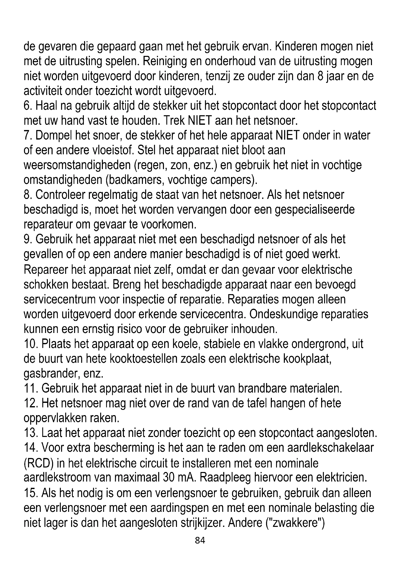 ouder dan 8 jaar en personen met beperkte fysieke, sensorische of mentale capaciteiten, of personen zonder ervaring of kennis van het apparaat, als dit gebeurt onder toezicht van een persoon die verantwoordelijk is voor hun veiligheid of als zij instructies hebben gekregen over het veilige gebruik van het apparaat en zich bewust zijn van84 de gevaren die gepaard gaan met het gebruik ervan. Kinderen mogen niet met de uitrusting spelen. Reiniging en onderhoud van de uitrusting mogen niet worden uitgevoerd door kinderen, tenzij ze ouder zijn dan 8 jaar en de activiteit onder toezicht wordt uitgevoerd.