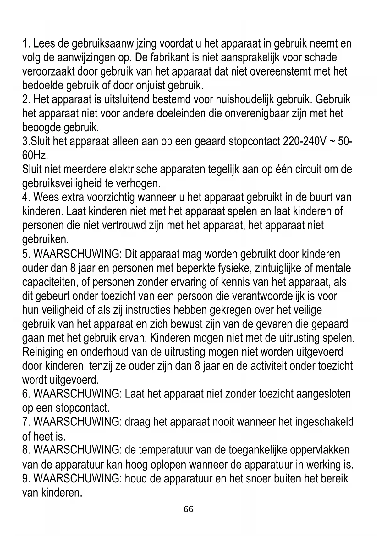 het apparaat niet voor andere doeleinden die onverenigbaar zijn met het beoogde gebruik. 3.Sluit het apparaat alleen aan op een geaard stopcontact 220-240V ~ 50- 60Hz. Sluit niet meerdere elektrische apparaten tegelijk aan op één circuit om de gebruiksveiligheid te verhogen.