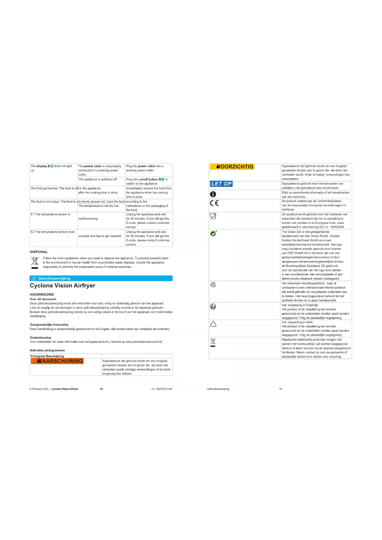 - Vervang nooit zelf de voedingskabel. Laat de voedingskabel altijd vervangen door de fabrikant, diens service-agent of een14 15© Princess 2023 | Cyclone Vision Airfryer | 01.182270.01.001 Gebruiksaanwijzing even gekwalificeerde persoon.