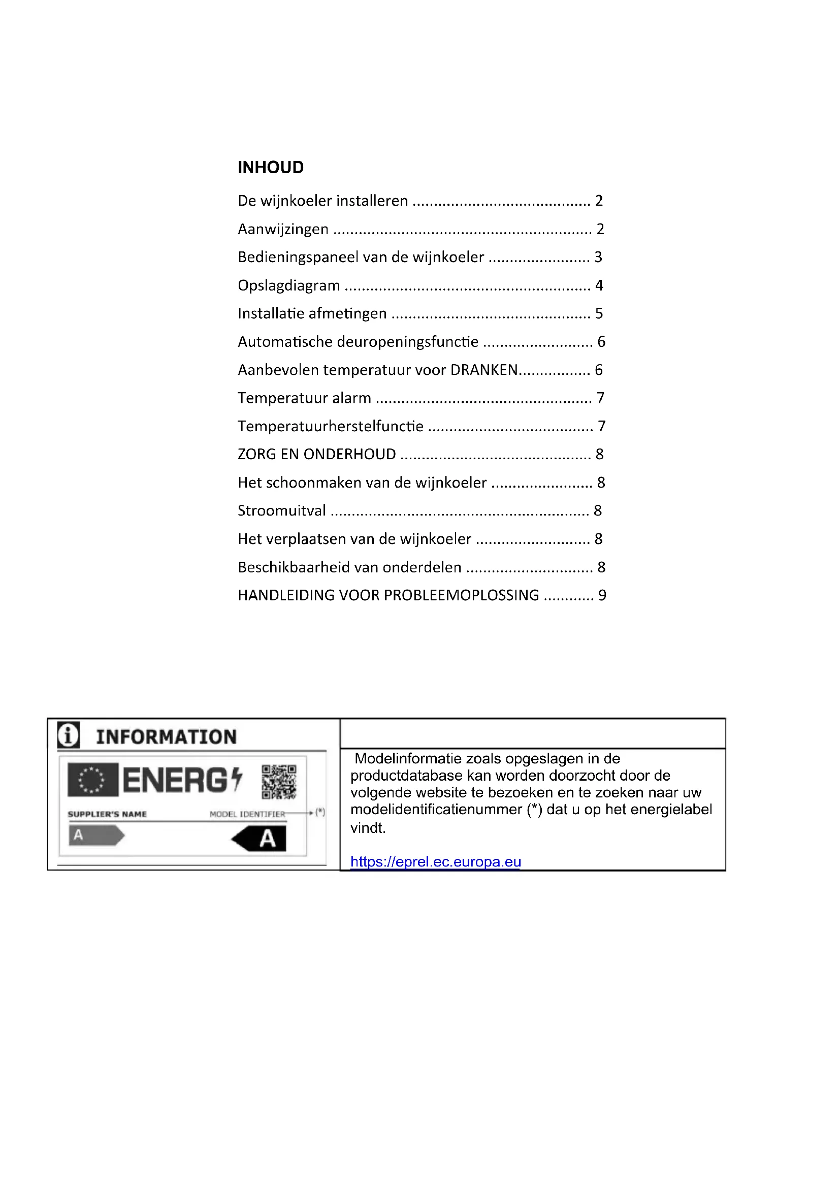 Modelinformatie zoals opgeslagen in de productdatabase kan worden doorzocht door de volgende website te bezoeken en te zoeken naar uw modelidentificatienummer (*) dat u op het energielabel vindt. https://eprel.ec.europa.euOm volledige ondersteuning te ontvangen, registreert u uw product op www.register10.eu De wijnkoeler installeren Dit apparaat is ontworpen om als inbouw (volledig ingebouwd) huishoudelijk apparaat te worden geïnstalleerd (zie locatiesticker op de achterkant van dit apparaat). De deur is niet omkeerbaar. Probeer niet de deur om te draaien. Dit apparaat is uitsluitend bedoeld voor het bewaren van wijn. Plaats de wijnkoeler op een vloer die sterk genoeg is om de wijnkoeler te dragen wanneer deze helemaal vol is. Om de wijnkoeler waterpas te zetten, stelt u de voorste stelvoet aan de onderkant van de wijnkoeler af. Plaats de wijnkoeler uit de buurt van direct zonlicht en warmtebronnen (fornuis, verwarmingsapparatuur, radiator, enz.). Direct zonlicht kan de acrylcoating beschadigen en warmtebronnen kunnen het elektriciteitsverbruik verhogen. Ook extreem lage omgevingstemperaturen en vochtige ruimtes kunnen ervoor zorgen dat het apparaat niet goed functioneert. Sluit de wijnkoeler aan op een speciaal, correct geïnstalleerd en geaard stopcontact. Voor vragen over stroom en/of aarding kunt u contact opnemen met een erkende elektricien of een erkend product- servicecentrum. Aanwijzingen Bewaar wijn in afgesloten flessen; Voorkom overbelasting van het apparaat; Open de deur alleen als het echt nodig is; Als u de deur gedurende langere tijd open laat staan, kan de temperatuur in de compartimenten van het apparaat aanzienlijk stijgen. Reinig regelmatig oppervlakken die in contact kunnen komen met flessen en toegankelijke afvoersystemen. Als de koelkast gedurende langere tijd leeg blijft staan, raden wij u aan deze uit te schakelen, te ontdooien, schoon te maken, te drogen en de deur open te laten staan om schimmelvorming in het apparaat te voorkomen. Bedek planken niet met aluminiumfolie of ander materiaal dat de luchtcirculatie kan belemmeren; Als de wijnkoeler gedurende langere tijd niet wordt gebruikt, wordt aanbevolen om na zorgvuldige reiniging de deur op een kier te laten staan, zodat de lucht in het apparaat kan circuleren en condensvorming, schimmel of nare geuren worden voorkomen. Dit product bevat een lichtbron van energie-efficiëntieklasse G