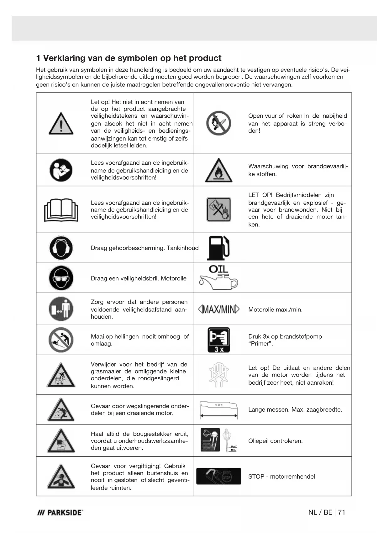 11a. 1 x frame 1 x Gebruiksaanwijzing 5 Beoogd gebruik De benzine grasmaaier is geschikt voor particulier ge- bruik in de tuin of hobbytuin. Grasmaaier voor de parti- culiere tuin of hobbytuin zijn machines waarvan het jaarlijks gebruik in principe niet meer is dan 50 uur en voornamelijk voor het onderhoud van gras- of ga- zonoppervlakken wordt gebruikt, echter niet in open- bare installaties, parken, sportvelden, alsook in de land- en bosbouw. Het product mag uitsluitend worden gebruikt waarvoor het bedoeld is. Elk ander of verdergaand- is niet vol- gens de voorschriften. Voor hieruit ontstane schade of verwondingen, van welke soort dan ook, is de gebrui- ker en niet de fabrikant aansprakelijk. Ook de naleving van de veiligheidsvoorschriften, de montagehandleiding en de aanwijzingen in de ge- bruikshandleiding maken deel uit van het beoogd ge- bruik. Personen, die het product bedienen of onderhoud aan het product verrichten, moeten hiermee bekend zijn en op de hoogte zijn van de mogelijke gevaren. NL / BE | 73De fabrikant is niet aansprakelijk voor wijzigingen die aan het product worden aangebracht en de hieruit voortvloeiende schade. Het product mag uitsluitend met de originele onderde- len en originele accessoires van de fabrikant worden gebruikt. De veiligheids-, werk- en onderhoudsvoorschriften van de fabrikant alsook de in de technische gegevens aan- gegeven afmetingen moeten in acht worden genomen. WAARSCHUWING Lees voor de ingebruikname van het product deze handleiding voor uw eigen veiligheid en de algemene veiligheidsvoorschriften grondig door. Als u het pro- duct aan derden geeft om te gebruiken, dient u deze gebruikshandleiding altijd mee te leveren. 6 Gebruik dat niet conform de voorschriften is Let erop dat onze producten volgens het beoogd ge- bruik niet voor bedrijfsmatige, ambachtelijke of indus- triële toepassingen zijn ontworpen. Wij aanvaarden geen aansprakelijkheid wanneer het product in be- drijfsmatige, ambachtelijke of industriële ondernemin- gen of bij soortgelijke werkzaamheden worden ingezet. WAARSCHUWING Vanwege gevaar voor lichamelijk letsel van de gebruiker, mag de grasmaaier niet voor de volgende werkzaamheden worden ge- bruikt (onvolledige opsomming): – voor het snoeien van bosjes, heggen en struiken, – voor snoeien van klimplanten, – voor gazononderhoud op dakbeplantingen en in balkonbakken, – voor hakselen en verkleinen van snoeiafval van bomen en heggen, – voor het reinigen van voetpaden (afzuigen, bla- zen), – voor het effenen van bodemverhogingen, zoals bijv. molshopen, – voor het transporteren van snoeimateriaal anders dan in de daarvoor aanwezige grasopvangbak. Verklaring van de signaalwoorden in de gebruikershandleiding GEVAAR Signaalwoord voor aanduiding van een di- rect aanwezige, gevaarlijke situatie die, in- dien deze niet wordt vermeden, de dood of ernstige verwondingen tot gevolgd heeft. WAARSCHUWING Signaalwoord voor aanduiding van een mo- gelijke gevaarlijke situatie die, indien deze niet wordt vermeden, tot de dood of ernsti- ge verwondingen kan leiden. VOORZICHTIG Signaalwoord voor aanduiding van een mo- gelijke gevaarlijke situatie die, indien deze niet wordt vermeden, tot geringe of matige verwondingen kan leiden. LET OP Signaalwoord voor aanduiding van een mo- gelijke gevaarlijke situatie die, indien deze niet wordt vermeden, materiële schade aan producten of eigendommen tot gevolg kan hebben. 7 Veiligheidsvoorschriften Bewaar alle veiligheidsvoorschriften en -aanwijzingen voor toekomstig gebruik! WAARSCHUWING Lees alle veiligheidsvoorschriften, aanwij- zingen, afbeeldingen en technische gege- vens die bij dit product zijn meegeleverd. Het niet naleven van de onderstaande aanwijzingen kunnen ernstige verwondingen veroorzaken. 74 | NL / BEWAARSCHUWING Voordat u met het product gaat werken, moet u zich vertrouwd maken met alle bedieningsonderdelen. – Oefen het gebruik van het product en laat u de werking, het werkingsmechanisme en de werk- technieken uitleggen door een ervaren gebruiker of specialist. – Zorg ervoor dat u het product onmiddellijk kunt stoppen in geval van nood. – Ondeskundig onderhoud van het product kan lei- den tot ernstig letsel. – Als er zich tijdens het gebruik een ongeluk of sto- ring voordoet, schakelt u het product onmiddellijk uit. Behandel verwondingen op de juiste manier of zoek medische hulp. Wie mogen het product niet gebruiken: