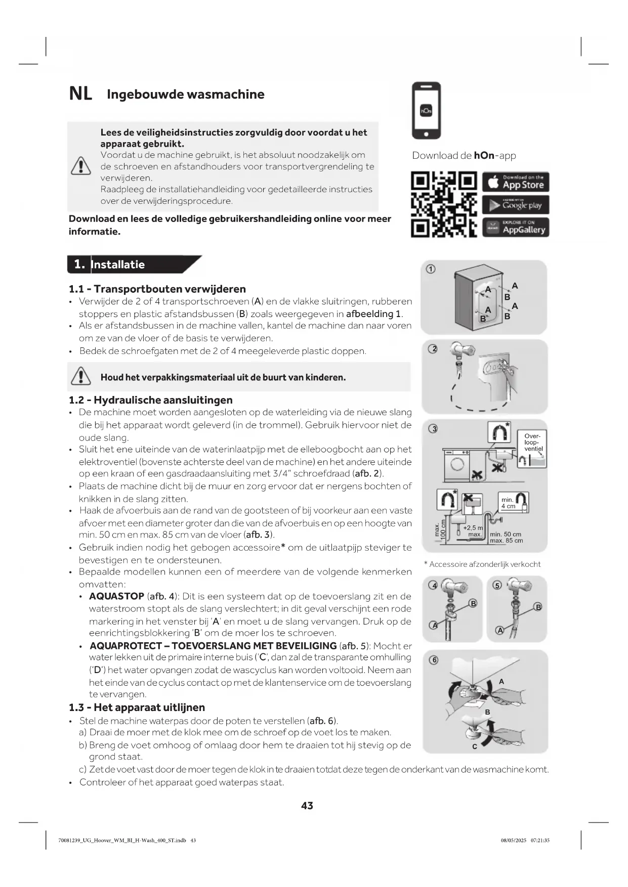 Lees de veiligheidsinstructies zorgvuldig door voordat u het apparaat gebruikt. Voordat u de machine gebruikt, is het absoluut noodzakelk om de schroeven en afstandhouders voor transportvergrendeling te verwderen. Raadpleeg de installatiehandleiding voor gedetailleerde instructies over de verwderingsprocedure. Download en lees de volledige gebruikershandleiding online voor meer informatie. Download de hOn-app