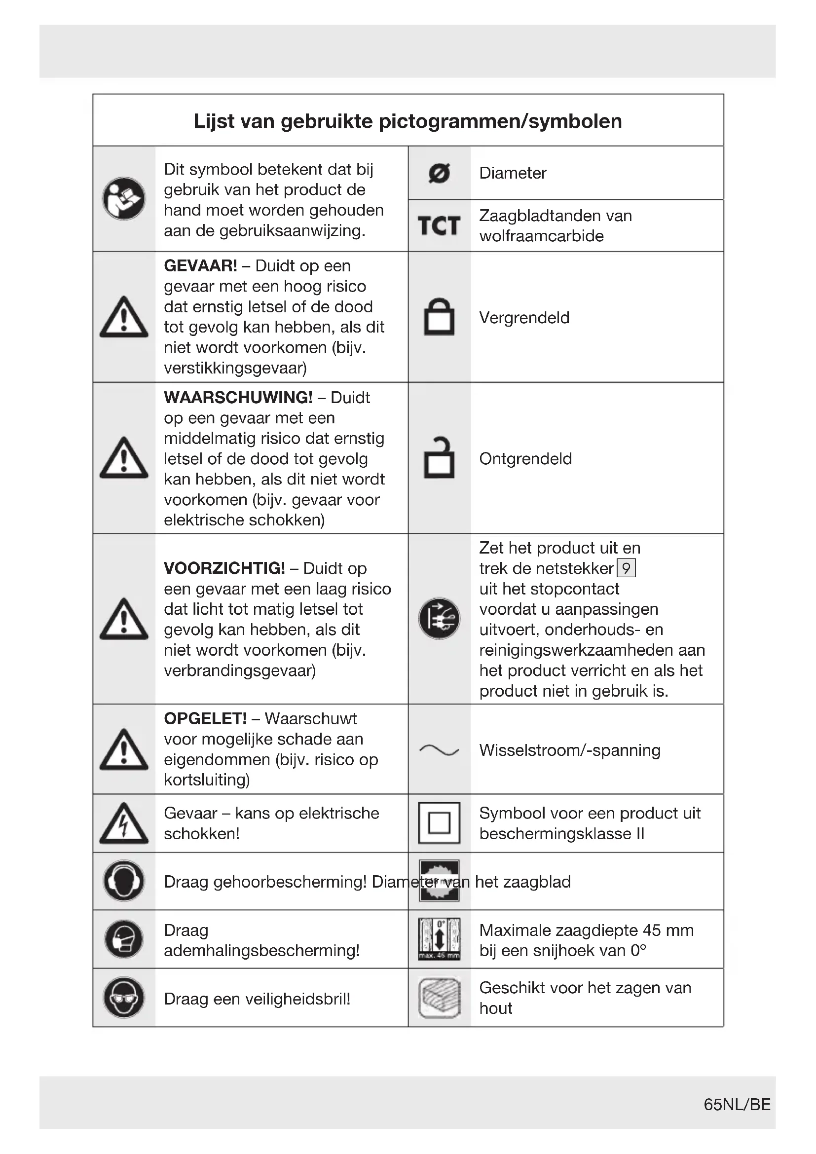 Zet het product uit en trek de netstekker [9] uit het stopcontact voordat u aanpassingen uitvoert, onderhouds- en reinigingswerkzaamheden aan het product verricht en als het product niet in gebruik is. OPGELET! –Waarschuwt voor mogelijke schade aan eigendommen (bijv. risico op kortsluiting) Wisselstroom/-spanning Gevaar– kans op elektrische schokken! Symbool voor een product uit beschermingsklasseII Draag gehoorbescherming! Diameter van het zaagblad
