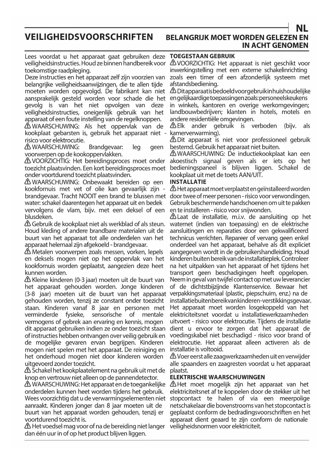 Lees voordat u het apparaat gaat gebruiken deze veiligheidsinstructies. Houd ze binnen handbereik voor toekomstige raadpleging. Deze instructies en het apparaat zelf zijn voorzien van belangrijke veiligheidsaanwijzingen, die te allen tijde moeten worden opgevolgd. De fabrikant kan niet aansprakelijk gesteld worden voor schade die het gevolg is van het niet opvolgen van deze veiligheidsinstructies, oneigenlijk gebruik van het apparaat of een foute instelling van de regelknoppen. WAARSCHUWING: Als het oppervlak van de kookplaat gebarsten is, gebruik het apparaat niet - risico voor elektrocutie. WAARSCHUWING: Brandgevaar: leg geen voorwerpen op de kookoppervlakken. VOORZICHTIG: Het bereidingsproces moet onder toezicht plaatsvinden. Een kort bereidingsproces moet onder voortdurend toezicht plaatsvinden. WAARSCHUWING: Onbewaakt bereiden op een kookfornuis met vet of olie kan gevaarlijk zijn - brandgevaar. Tracht NOOIT een brand te blussen met water: schakel daarentegen het apparaat uit en bedek vervolgens de vlam, bijv. met een deksel of een blusdeken. Gebruik de kookplaat niet als werkblad of als steun. Houd kleding of andere brandbare materialen uit de buurt van het apparaat tot alle onderdelen van het apparaat helemaal zijn afgekoeld - brandgevaar. Metalen voorwerpen zoals messen, vorken, lepels en deksels mogen niet op het oppervlak van het kookfornuis worden geplaatst, aangezien deze heet kunnen worden. Kleine kinderen (0-3jaar) moeten uit de buurt van het apparaat gehouden worden. Jonge kinderen (3-8 jaar) moeten uit de buurt van het apparaat gehouden worden, tenzij ze constant onder toezicht staan. Kinderen vanaf 8 jaar en personen met verminderde fysieke, sensorische of mentale vermogens of gebrek aan ervaring en kennis, mogen dit apparaat gebruiken indien ze onder toezicht staan of instructies hebben ontvangen over veilig gebruik en de mogelijke gevaren ervan begrijpen. Kinderen mogen niet spelen met het apparaat. De reiniging en het onderhoud mogen niet door kinderen worden uitgevoerd zonder toezicht. Schakel het kookplaatelement na gebruik uit met de knop en vertrouw niet alleen op de pannendetector. WAARSCHUWING: Het apparaat en de toegankelijke onderdelen kunnen heet worden tijdens het gebruik. Wees voorzichtig dat u de verwarmingselementen niet aanraakt. Kinderen jonger dan 8 jaar moeten uit de buurt van het apparaat worden gehouden, tenzij er voortdurend toezicht is. Het voedsel mag voor of na de bereiding niet langer dan één uur in of op het product blijven liggen. TOEGESTAAN GEBRUIK VOORZICHTIG: Het apparaat is niet geschikt voor inwerkingstelling met een externe schakelinrichting zoals een timer of een afzonderlijk systeem met afstandsbediening. Dit apparaat is bedoeld voor gebruik in huishoudelijke en gelijkaardige toepassingen zoals: personeelskeukens in winkels, kantoren en overige werkomgevingen; landbouwbedrijven; klanten in hotels, motels en andere residentiële omgevingen. Elk ander gebruik is verboden (bijv. als kamerverwarming). Dit apparaat is niet voor professioneel gebruik bestemd. Gebruik het apparaat niet buiten. WAARSCHUWING: De inductiekookplaat kan een akoestisch signaal geven als er iets op het bedieningspaneel is blijven liggen. Schakel de kookplaat uit met de toets AAN/UIT. INSTALLATIE Het apparaat moet verplaatst en geïnstalleerd worden door twee of meer personen - risico voor verwondingen. Gebruik beschermende handschoenen om uit te pakken en te installeren - risico voor snijwonden. Laat de installatie, m.i.v. de aansluiting op het waternet (indien van toepassing) en de elektrische aansluitingen en reparaties door een gekwaliceerd technicus verrichten. Repareer of vervang geen enkel onderdeel van het apparaat, behalve als dit expliciet aangegeven wordt in de gebruikershandleiding. Houd kinderen buiten bereik van de installatieplek. Controleer na het uitpakken van het apparaat of het tijdens het transport geen beschadigingen heeft opgelopen. Neem in geval van twijfel contact op met uw leverancier of de dichtstbijzijnde Klantenservice. Bewaar het verpakkingsmateriaal (plastic, piepschuim, enz.) na de installatie buiten bereik van kinderen - verstikkingsgevaar. Het apparaat moet worden losgekoppeld van het elektriciteitsnet voordat u installatiewerkzaamheden uitvoert - risico voor elektrocutie. Tijdens de installatie dient u ervoor te zorgen dat het apparaat de voedingskabel niet beschadigd - risico voor brand of elektrocutie. Het apparaat alleen activeren als de installatie is voltooid. Voer eerst alle zaagwerkzaamheden uit en verwijder alle spaanders en zaagresten voordat u het apparaat plaatst. ELEKTRISCHE WAARSCHUWINGEN Het moet mogelijk zijn het apparaat van het elektriciteitsnet af te koppelen door de stekker uit het stopcontact te halen of via een meerpolige netschakelaar die bovenstrooms van het stopcontact is geplaatst conform de bedradingsvoorschriften en het apparaat dient geaard te zijn conform de nationale veiligheidsnormen voor elektriciteit.Gebruik geen verlengsnoeren, meervoudige stopcontacten of adapters. Als de installatie voltooid is, mogen de elektrische onderdelen niet meer toegankelijk zijn voor de gebruiker. Gebruik het apparaat niet wanneer u natte voeten hebt of blootsvoets bent. Gebruik het apparaat niet als de stroomkabel of de stekker beschadigd is, als het apparaat niet goed werkt of als het beschadigd of gevallen is. Installatie met behulp van een netsnoerstekker is niet toegestaan, tenzij het product reeds is uitgerust met de door de fabrikant geleverde stekker. Als het netsnoer beschadigd is, moet het vervangen worden door de fabrikant, een servicevertegenwoordiger of gekwaliceerd personeel om risico’s te voorkomen - risico voor elektrocutie.