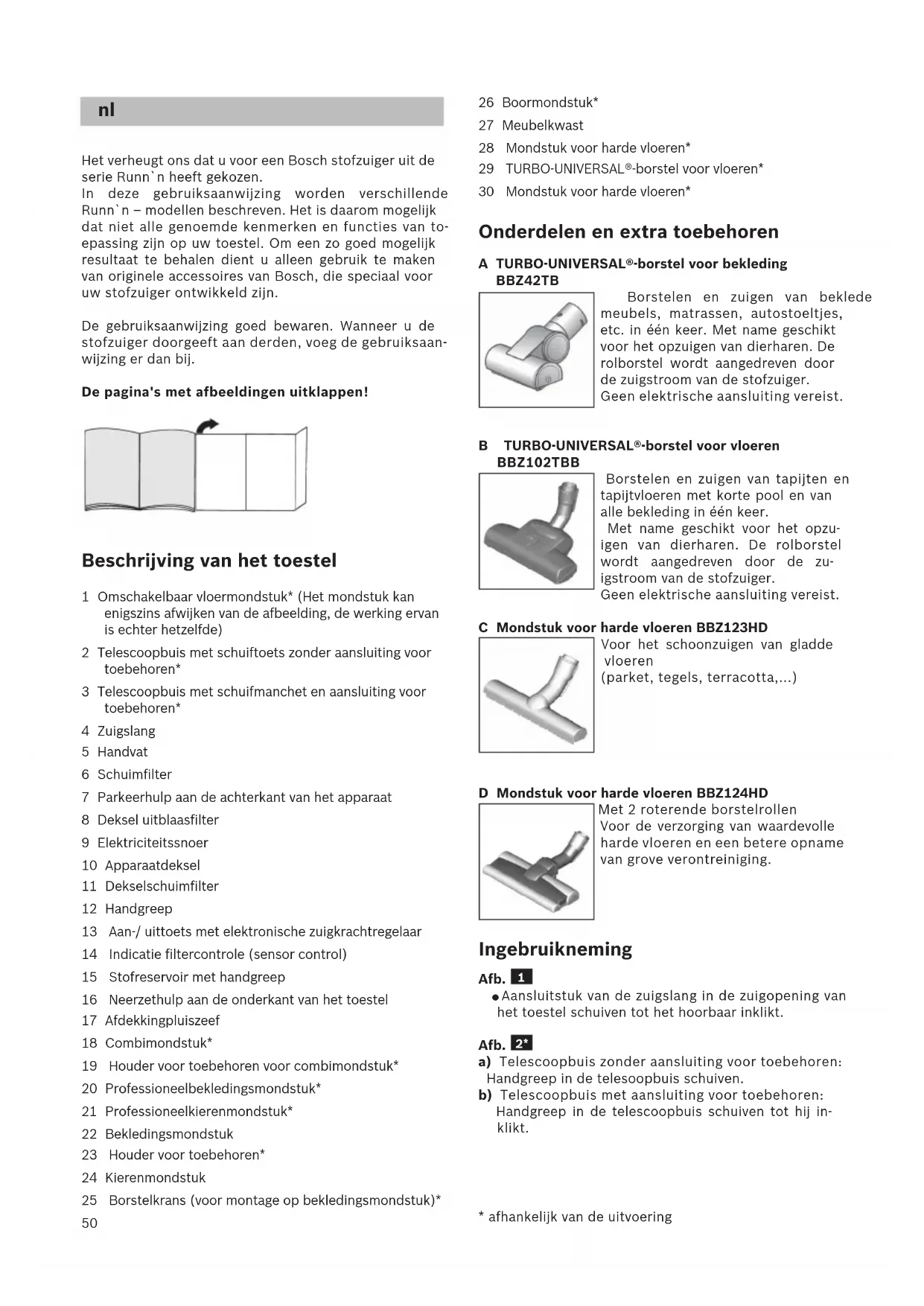 - a seconda della specifica dotazione50 Het verheugt ons dat u voor een Bosch stofzuiger uit de serie Runn`n heeft gekozen. In deze gebruiksaanwijzing worden verschillende Runn`n – modellen beschreven. Het is daarom mogelijk dat niet alle genoemde kenmerken en functies van to- epassing zijn op uw toestel. Om een zo goed mogelijk resultaat te behalen dient u alleen gebruik te maken van originele accessoires van Bosch, die speciaal voor uw stofzuiger ontwikkeld zijn. De gebruiksaanwijzing goed bewaren. Wanneer u de stofzuiger doorgeeft aan derden, voeg de gebruiksaan- wijzing er dan bij. De pagina's met afbeeldingen uitklappen! Beschrijving van het toestel 1 Omschakelbaar vloermondstuk* (Het mondstuk kan enigszins afwijken van de afbeelding, de werking ervan is echter hetzelfde) 2 Telescoopbuis met schuiftoets zonder aansluiting voor toebehoren* 3 Telescoopbuis met schuifmanchet en aansluiting voor toebehoren* 4 Zuigslang 5 Handvat 6 Schuimfilter 7 Parkeerhulp aan de achterkant van het apparaat 8 Deksel uitblaasfilter 9 Elektriciteitssnoer 10 Apparaatdeksel 11 Deksel schuimfilter 12 Handgreep 13 Aan-/ uittoets met elektronische zuigkrachtregelaar 14 Indicatie filtercontrole (sensor control) 15 Stofreservoir met handgreep 16 Neerzethulp aan de onderkant van het toestel 17 Afdekking pluiszeef 18 Combimondstuk* 19 Houder voor toebehoren voor combimondstuk* 20 Professioneel bekledingsmondstuk* 21 Professioneel kierenmondstuk* 22 Bekledingsmondstuk 23 Houder voor toebehoren* 24 Kierenmondstuk 25 Borstelkrans (voor montage op bekledingsmondstuk)* 26 Boormondstuk* 27 Meubelkwast 28 Mondstuk voor harde vloeren* 29 TURBO-UNIVERSAL®-borstel voor vloeren* 30 Mondstuk voor harde vloeren* Onderdelen en extra toebehoren A TURBO-UNIVERSAL®-borstel voor bekleding BBZ42TB Borstelen en zuigen van beklede meubels, matrassen, autostoeltjes, etc. in één keer. Met name geschikt voor het opzuigen van dierharen. De rolborstel wordt aangedreven door de zuigstroom van de stofzuiger. Geen elektrische aansluiting vereist. B TURBO-UNIVERSAL®-borstel voor vloeren BBZ102TBB Borstelen en zuigen van tapijten en tapijtvloeren met korte pool en van alle bekleding in één keer. Met name geschikt voor het opzu- igen van dierharen. De rolborstel wordt aangedreven door de zu- igstroom van de stofzuiger. Geen elektrische aansluiting vereist. C Mondstuk voor harde vloeren BBZ123HD Voor het schoonzuigen van gladde vloeren (parket, tegels, terracotta,...) D Mondstuk voor harde vloeren BBZ124HD Met 2 roterende borstelrollen Voor de verzorging van waardevolle harde vloeren en een betere opname van grove verontreiniging. Ingebruikneming Afb.