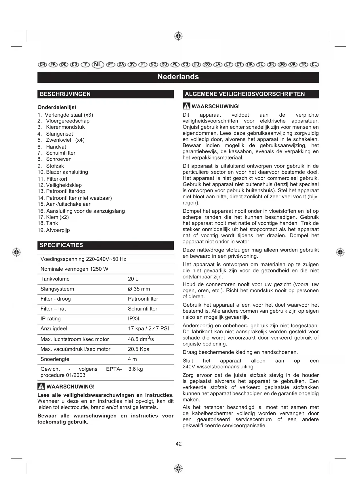 EN FR DE ES IT PT DA SV FI NO RU PL CS HU RO LV LT ET HR SL SK UKBG TR EL ALGEMENE VEILIGHEIDSVOORSCHRIFTEN WAARSCHUWING! Dit apparaat voldoet aan de verplichte veiligheidsvoorschriften voor elektrische apparatuur. Onjuist gebruik kan echter schadelijk zijn voor mensen en eigendommen. Lees deze gebruiksaanwijzing zorgvuldig en volledig door, alvorens het apparaat in te schakelen. Bewaar indien mogelijk de gebruiksaanwijzing, het garantiebewijs, de kassabon, evenals de verpakking en het verpakkingsmateriaal. Dit apparaat is uitsluitend ontworpen voor gebruik in de particuliere sector en voor het daarvoor bestemde doel. Het apparaat is niet geschikt voor commercieel gebruik. Gebruik het apparaat niet buitenshuis (tenzij het speciaal is ontworpen voor gebruik buitenshuis). Stel het apparaat niet bloot aan hitte, direct zonlicht of zeer veel vocht (bijv. regen). Dompel het apparaat nooit onder in vloeistoffen en let op scherpe randen die het kunnen beschadigen. Gebruik het apparaat nooit met natte of vochtige handen. Trek de stekker onmiddellijk uit het stopcontact als het apparaat nat of vochtig wordt tijdens het draaien. Dompel het apparaat niet onder in water. Deze natte/droge stofzuiger mag alleen worden gebruikt en bewaard in een privéwoning. Het apparaat is ontworpen om materialen op te zuigen die niet gevaarlijk zijn voor de gezondheid en die niet ontvlambaar zijn. Houd de connectoren nooit voor uw gezicht (vooral uw ogen, oren, etc.). Richt het mondstuk nooit op personen of dieren. Gebruik het apparaat alleen voor het doel waarvoor het bestemd is. Alle andere vormen van gebruik zijn op eigen risico en mogelijk gevaarlijk. Andersoortig en onbeheerd gebruik zijn niet toegestaan. De fabrikant kan niet aansprakelijk worden gesteld voor schade die wordt veroorzaakt door verkeerd gebruik of onjuiste bediening. Draag beschermende kleding en handschoenen. Sluit het apparaat alleen aan op een 240V-wisselstroomaansluiting. Zorg ervoor dat de juiste stofzak stevig in de houder is geplaatst alvorens het apparaat te gebruiken. Een verkeerde stofzak of verkeerd geplaatste stofzakken kunnen het apparaat beschadigen en de garantie ongeldig maken. Als het netsnoer beschadigd is, moet het samen met de kabelbeschermer volledig worden vervangen door een geautoriseerd servicecentrum of een andere gekwalifi ceerde serviceorganisatie. BESCHRIJVINGEN Onderdelenlijst