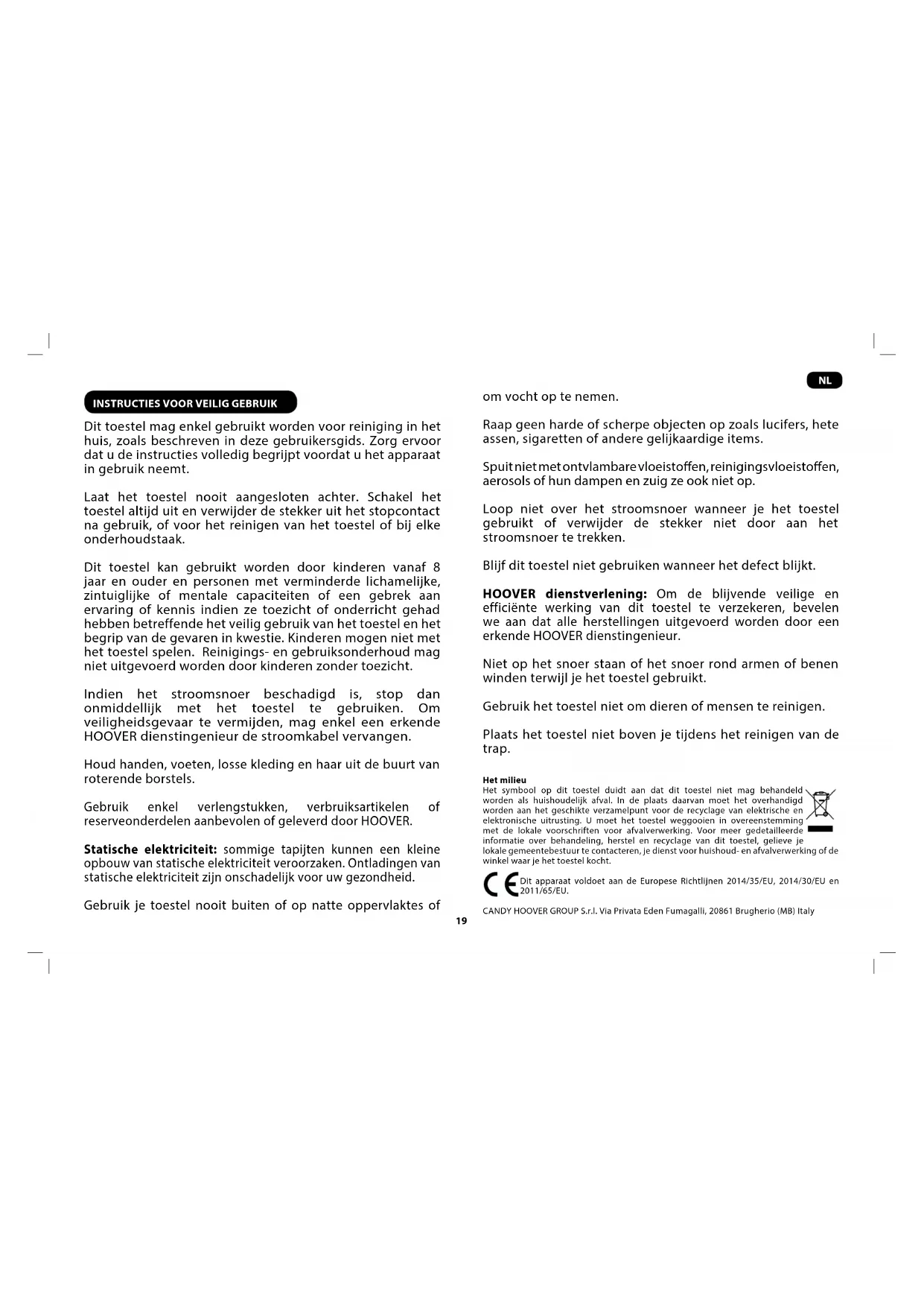 Dit toestel mag enkel gebruikt worden voor reiniging in het huis, zoals beschreven in deze gebruikersgids. Zorg ervoor dat u de instructies volledig begrijpt voordat u het apparaat in gebruik neemt. Laat het toestel nooit aangesloten achter. Schakel het toestel altijd uit en verwijder de stekker uit het stopcontact na gebruik, of voor het reinigen van het toestel of bij elke onderhoudstaak. Dit toestel kan gebruikt worden door kinderen vanaf 8 jaar en ouder en personen met verminderde lichamelijke, zintuiglijke of mentale capaciteiten of een gebrek aan ervaring of kennis indien ze toezicht of onderricht gehad hebben betreffende het veilig gebruik van het toestel en het begrip van de gevaren in kwestie. Kinderen mogen niet met het toestel spelen. Reinigings- en gebruiksonderhoud mag niet uitgevoerd worden door kinderen zonder toezicht. Indien het stroomsnoer beschadigd is, stop dan onmiddellijk met het toestel te gebruiken. Om veiligheidsgevaar te vermijden, mag enkel een erkende HOOVER dienstingenieur de stroomkabel vervangen. Houd handen, voeten, losse kleding en haar uit de buurt van roterende borstels. Gebruik enkel verlengstukken, verbruiksartikelen of reserveonderdelen aanbevolen of geleverd door HOOVER. Statische elektriciteit: sommige tapijten kunnen een kleine opbouw van statische elektriciteit veroorzaken. Ontladingen van statische elektriciteit zijn onschadelijk voor uw gezondheid. Gebruik je toestel nooit buiten of op natte oppervlaktes of om vocht op te nemen. Raap geen harde of scherpe objecten op zoals lucifers, hete assen, sigaretten of andere gelijkaardige items. Spuit niet met ontvlambare vloeistoen, reinigingsvloeistoen, aerosols of hun dampen en zuig ze ook niet op. Loop niet over het stroomsnoer wanneer je het toestel gebruikt of verwijder de stekker niet door aan het stroomsnoer te trekken. Blijf dit toestel niet gebruiken wanneer het defect blijkt. HOOVER dienstverlening: Om de blijvende veilige en efficiënte werking van dit toestel te verzekeren, bevelen we aan dat alle herstellingen uitgevoerd worden door een erkende HOOVER dienstingenieur. Niet op het snoer staan of het snoer rond armen of benen winden terwijl je het toestel gebruikt. Gebruik het toestel niet om dieren of mensen te reinigen. Plaats het toestel niet boven je tijdens het reinigen van de trap. Het milieu Het symbool op dit toestel duidt aan dat dit toestel niet mag behandeld worden als huishoudelijk afval. In de plaats daarvan moet het overhandigd worden aan het geschikte verzamelpunt voor de recyclage van elektrische en elektronische uitrusting. U moet het toestel weggooien in overeenstemming met de lokale voorschriften voor afvalverwerking. Voor meer gedetailleerde informatie over behandeling, herstel en recyclage van dit toestel, gelieve je lokale gemeentebestuur te contacteren, je dienst voor huishoud- en afvalverwerking of de winkel waar je het toestel kocht. Dit apparaat voldoet aan de Europese Richtlijnen 2014/35/EU, 2014/30/EU en 2011/65/EU. CANDY HOOVER GROUP S.r.l. Via Privata Eden Fumagalli, 20861 Brugherio (MB) Italy
