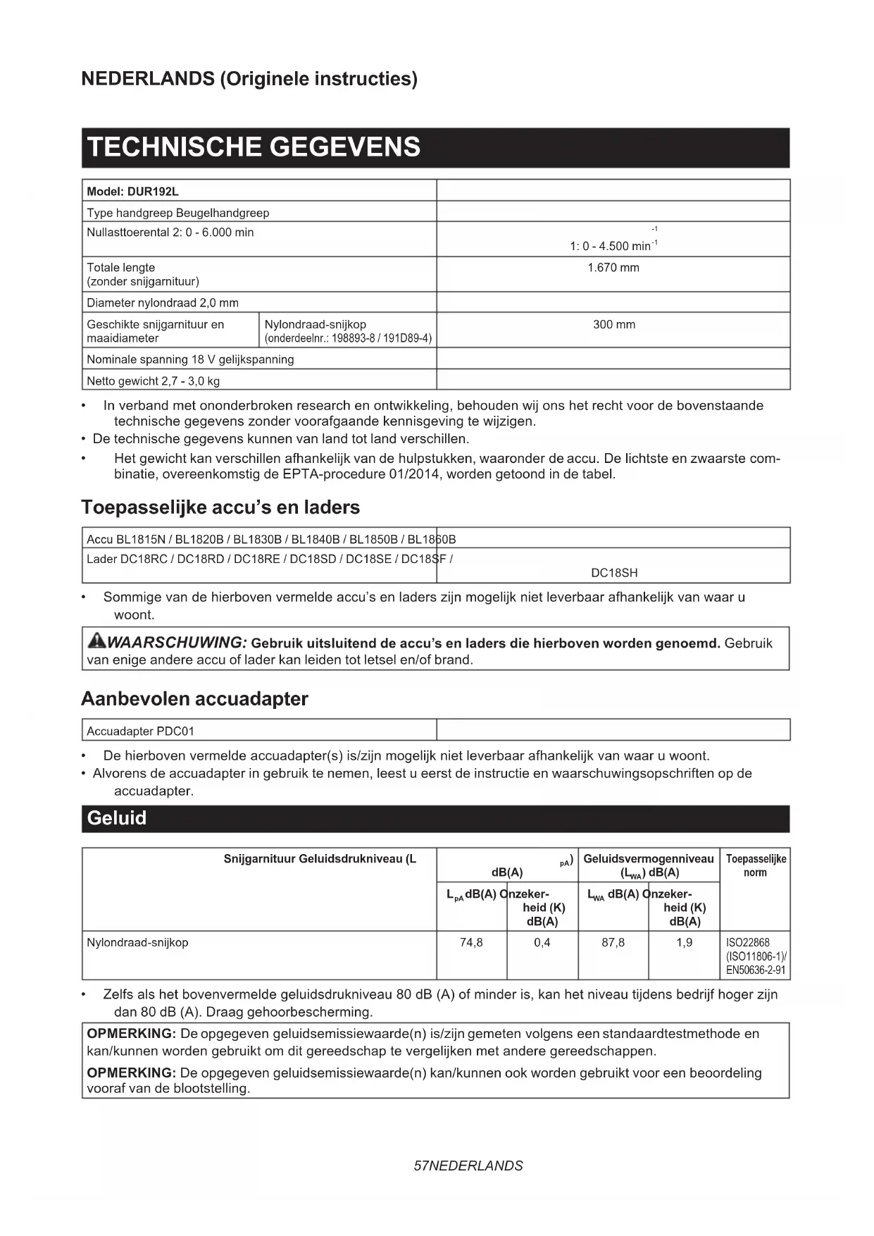 - Alvorens de accuadapter in gebruik te nemen, leest u eerst de instructie en waarschuwingsopschriften op de accuadapter. Geluid Snijgarnituur Geluidsdrukniveau (L