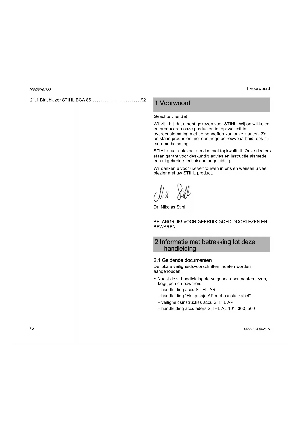 Nederlands 1 Voorwoord Geachte cliënt(e), Wij zijn blij dat u hebt gekozen voor STIHL. Wij ontwikkelen en produceren onze producten in topkwaliteit in overeenstemming met de behoeften van onze klanten. Zo ontstaan producten met een hoge betrouwbaarheid, ook bij extreme belasting. STIHL staat ook voor service met topkwaliteit. Onze dealers staan garant voor deskundig advies en instructie alsmede een uitgebreide technische begeleiding. Wij danken u voor uw vertrouwen in ons en wensen u veel plezier met uw STIHL product. Dr. Nikolas Stihl