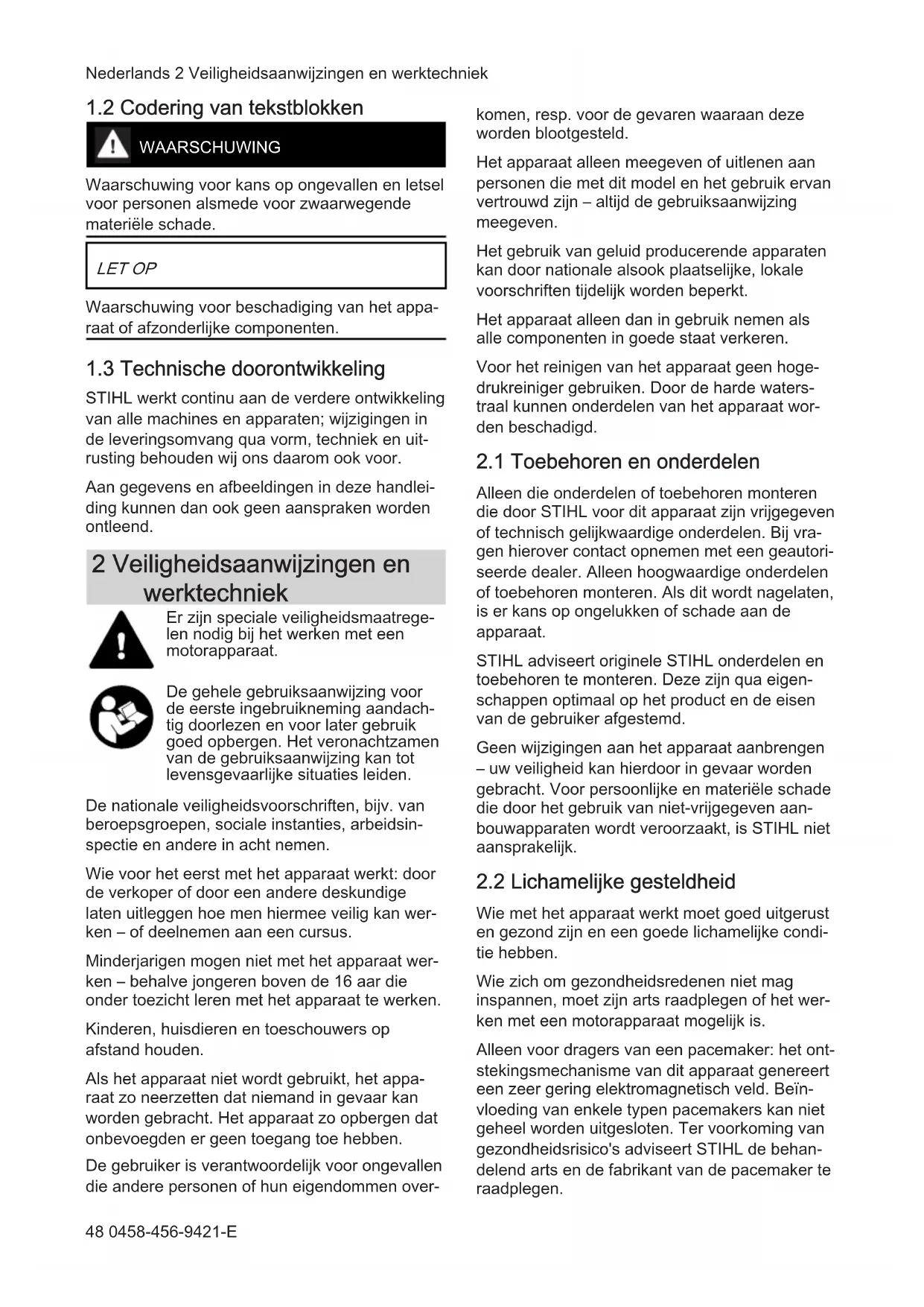 Wie met het apparaat werkt moet goed uitgerust en gezond zijn en een goede lichamelijke condi‐ tie hebben. Wie zich om gezondheidsredenen niet mag inspannen, moet zijn arts raadplegen of het wer‐ ken met een motorapparaat mogelijk is. Alleen voor dragers van een pacemaker: het ont‐ stekingsmechanisme van dit apparaat genereert een zeer gering elektromagnetisch veld. Beïn‐ vloeding van enkele typen pacemakers kan niet geheel worden uitgesloten. Ter voorkoming van gezondheidsrisico's adviseert STIHL de behan‐ delend arts en de fabrikant van de pacemaker te raadplegen. Nederlands 2 Veiligheidsaanwijzingen en werktechniek 48 0458-456-9421-ENa gebruik van alcohol, medicijnen die het reac‐ tievermogen beïnvloeden of drugs mag niet met het apparaat worden gewerkt.