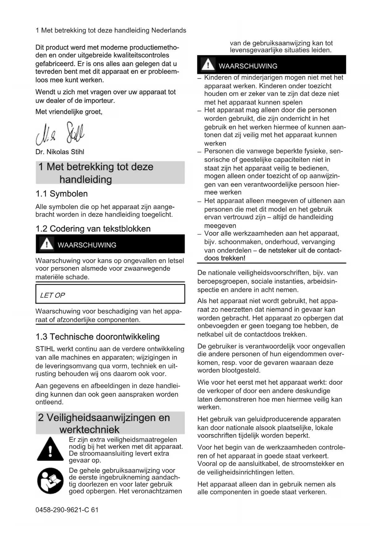 - 16 UKCA-conformiteitsverklaring Geachte cliënt(e), Het doet ons veel genoegen dat u hebt gekozen voor een kwaliteitsproduct van de firma STIHL. Nederlands 16 Dichiarazione di conformità UKCA 60 0458-290-9621-C © ANDREAS STIHL AG & Co. KG 2022 0458-290-9621-C. VA0.M21. Gedrukt op chloorvrij gebleekt papier. Drukinkten bevatten plantaardige olie, papier is recyclebaar. Originele handleiding 0000007626_011_NLDit product werd met moderne productiemetho‐ den en onder uitgebreide kwaliteitscontroles gefabriceerd. Er is ons alles aan gelegen dat u tevreden bent met dit apparaat en er probleem‐ loos mee kunt werken. Wendt u zich met vragen over uw apparaat tot uw dealer of de importeur. Met vriendelijke groet, Dr. Nikolas Stihl 1 Met betrekking tot deze handleiding p. 75