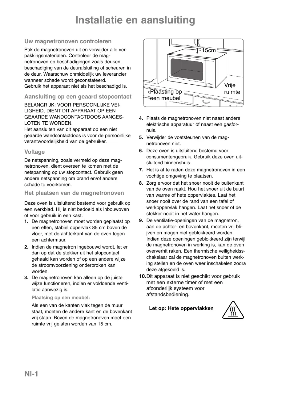 wijze functioneren, indien er voldoende ventilatie aanwezig is. Plaatsing op een meubel: Als een van de kanten vlak tegen de muur staat, moeten de andere kant en de bovenkant vrij staan. Boven de magnetronoven moet een ruimte vrij gelaten worden van 15 cm. Nl-1 15cm Plaasting op een meubel Vrije ruimte