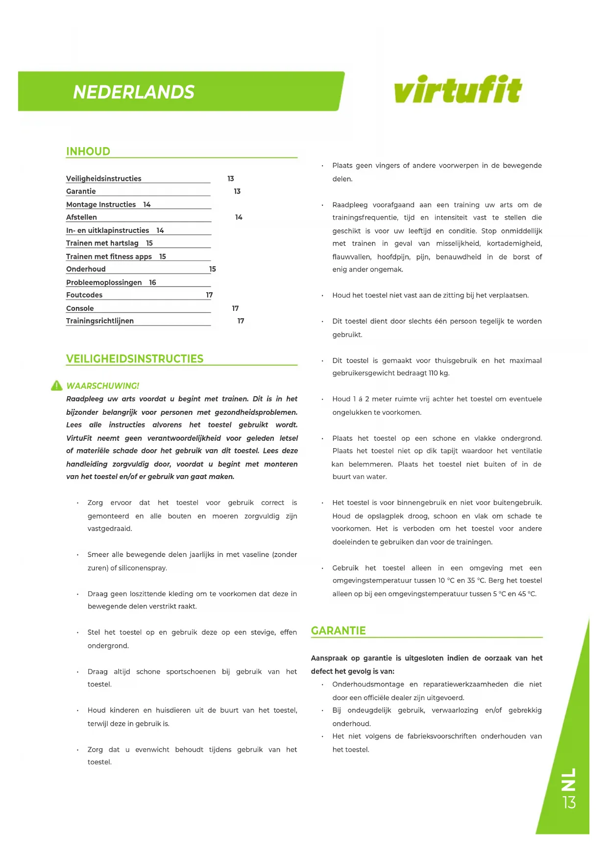 INHOUD Veiligheidsinstructies 13 Garantie 13 Montage Instructies 14 Afstellen 14 In- en uitklapinstructies 14 Trainen met hartslag 15 Trainen met fitness apps 15 Onderhoud 15 Probleemoplossingen 16 Foutcodes 17 Console 17 Trainingsrichtlijnen 17 VEILIGHEIDSINSTRUCTIES WAARSCHUWING! Raadpleeg uw arts voordat u begint met trainen. Dit is in het bijzonder belangrijk voor personen met gezondheidsproblemen. Lees alle instructies alvorens het toestel gebruikt wordt. VirtuFit neemt geen verantwoordelijkheid voor geleden letsel of materiële schade door het gebruik van dit toestel. Lees deze handleiding zorgvuldig door, voordat u begint met monteren van het toestel en/of er gebruik van gaat maken.