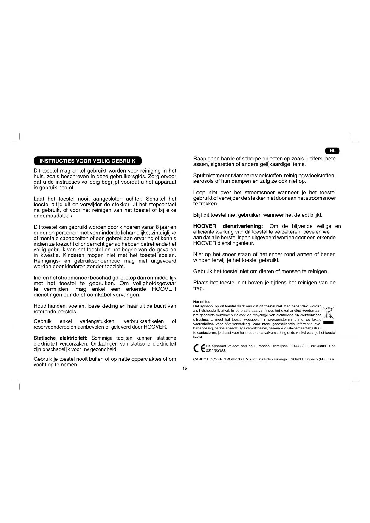Dit toestel mag enkel gebruikt worden voor reiniging in het huis, zoals beschreven in deze gebruikersgids. Zorg ervoor dat u de instructies volledig begrijpt voordat u het apparaat in gebruik neemt. Laat het toestel nooit aangesloten achter. Schakel het toestel altijd uit en verwijder de stekker uit het stopcontact na gebruik, of voor het reinigen van het toestel of bij elke onderhoudstaak. Dit toestel kan gebruikt worden door kinderen vanaf 8 jaar en ouder en personen met verminderde lichamelijke, zintuiglijke of mentale capaciteiten of een gebrek aan ervaring of kennis indien ze toezicht of onderricht gehad hebben betreffende het veilig gebruik van het toestel en het begrip van de gevaren in kwestie. Kinderen mogen niet met het toestel spelen. Reinigings- en gebruiksonderhoud mag niet uitgevoerd worden door kinderen zonder toezicht. Indien het stroomsnoer beschadigd is, stop dan onmiddellijk met het toestel te gebruiken. Om veiligheidsgevaar te vermijden, mag enkel een erkende HOOVER dienstingenieur de stroomkabel vervangen. Houd handen, voeten, losse kleding en haar uit de buurt van roterende borstels. Gebruik enkel verlengstukken, verbruiksartikelen of reserveonderdelen aanbevolen of geleverd door HOOVER. Statische elektriciteit: Sommige tapijten kunnen statische elektriciteit veroorzaken. Ontladingen van statische elektriciteit zijn onschadelijk voor uw gezondheid. Gebruik je toestel nooit buiten of op natte oppervlaktes of om vocht op te nemen. Raap geen harde of scherpe objecten op zoals lucifers, hete assen, sigaretten of andere gelijkaardige items. Spuit niet met ontvlambare vloeistoffen, reinigingsvloeistoffen, aerosols of hun dampen en zuig ze ook niet op. Loop niet over het stroomsnoer wanneer je het toestel gebruikt of verwijder de stekker niet door aan het stroomsnoer te trekken. Blijf dit toestel niet gebruiken wanneer het defect blijkt. HOOVER dienstverlening: Om de blijvende veilige en efciënte werking van dit toestel te verzekeren, bevelen we aan dat alle herstellingen uitgevoerd worden door een erkende HOOVER dienstingenieur. Niet op het snoer staan of het snoer rond armen of benen winden terwijl je het toestel gebruikt. Gebruik het toestel niet om dieren of mensen te reinigen. Plaats het toestel niet boven je tijdens het reinigen van de trap. Het milieu Het symbool op dit toestel duidt aan dat dit toestel niet mag behandeld worden als huishoudelijk afval. In de plaats daarvan moet het overhandigd worden aan het geschikte verzamelpunt voor de recyclage van elektrische en elektronische uitrusting. U moet het toestel weggooien in overeenstemming met de lokale voorschriften voor afvalverwerking. Voor meer gedetailleerde informatie over behandeling, herstel en recyclage van dit toestel, gelieve je lokale gemeentebestuur te contacteren, je dienst voor huishoud- en afvalverwerking of de winkel waar je het toestel kocht. Dit apparaat voldoet aan de Europese Richtlijnen 2014/35/EU, 2014/30/EU en 2011/65/EU. CANDY HOOVER GROUP S.r.l. Via Privata Eden Fumagalli, 20861 Brugherio (MB) Italy