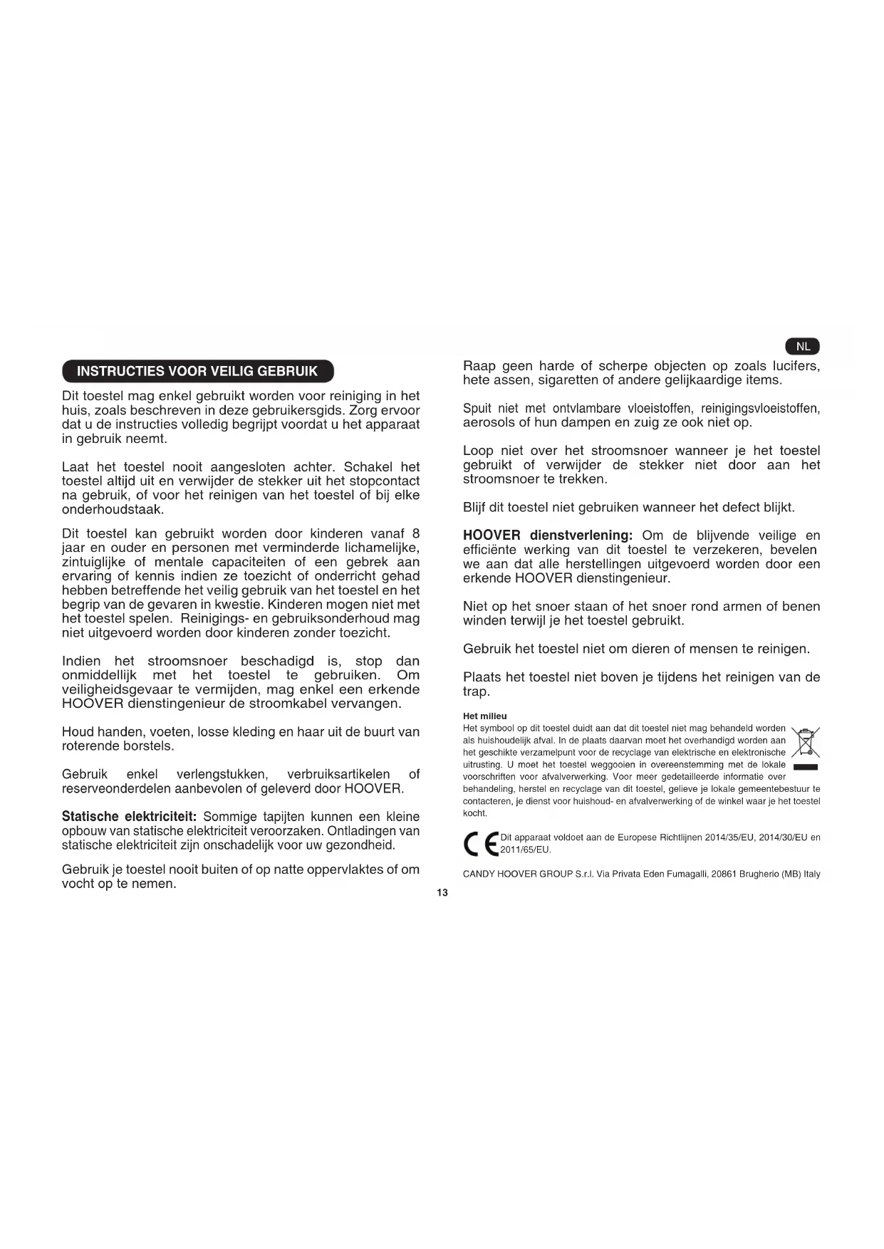 Dit toestel mag enkel gebruikt worden voor reiniging in het huis, zoals beschreven in deze gebruikersgids. Zorg ervoor dat u de instructies volledig begrijpt voordat u het apparaat in gebruik neemt. Laat het toestel nooit aangesloten achter. Schakel het toestel altijd uit en verwijder de stekker uit het stopcontact na gebruik, of voor het reinigen van het toestel of bij elke onderhoudstaak. Dit toestel kan gebruikt worden door kinderen vanaf 8 jaar en ouder en personen met verminderde lichamelijke, zintuiglijke of mentale capaciteiten of een gebrek aan ervaring of kennis indien ze toezicht of onderricht gehad hebben betreffende het veilig gebruik van het toestel en het begrip van de gevaren in kwestie. Kinderen mogen niet met het toestel spelen. Reinigings- en gebruiksonderhoud mag niet uitgevoerd worden door kinderen zonder toezicht. Indien het stroomsnoer beschadigd is, stop dan onmiddellijk met het toestel te gebruiken. Om veiligheidsgevaar te vermijden, mag enkel een erkende HOOVER dienstingenieur de stroomkabel vervangen. Houd handen, voeten, losse kleding en haar uit de buurt van roterende borstels. Gebruik enkel verlengstukken, verbruiksartikelen of reserveonderdelen aanbevolen of geleverd door HOOVER. Statische elektriciteit: Sommige tapijten kunnen een kleine opbouw van statische elektriciteit veroorzaken. Ontladingen van statische elektriciteit zijn onschadelijk voor uw gezondheid. Gebruik je toestel nooit buiten of op natte oppervlaktes of om vocht op te nemen. Raap geen harde of scherpe objecten op zoals lucifers, hete assen, sigaretten of andere gelijkaardige items. Spuit niet met ontvlambare vloeistoffen, reinigingsvloeistoffen, aerosols of hun dampen en zuig ze ook niet op. Loop niet over het stroomsnoer wanneer je het toestel gebruikt of verwijder de stekker niet door aan het stroomsnoer te trekken. Blijf dit toestel niet gebruiken wanneer het defect blijkt. HOOVER dienstverlening: Om de blijvende veilige en efciënte werking van dit toestel te verzekeren, bevelen we aan dat alle herstellingen uitgevoerd worden door een erkende HOOVER dienstingenieur. Niet op het snoer staan of het snoer rond armen of benen winden terwijl je het toestel gebruikt. Gebruik het toestel niet om dieren of mensen te reinigen. Plaats het toestel niet boven je tijdens het reinigen van de trap. Het milieu Het symbool op dit toestel duidt aan dat dit toestel niet mag behandeld worden als huishoudelijk afval. In de plaats daarvan moet het overhandigd worden aan het geschikte verzamelpunt voor de recyclage van elektrische en elektronische uitrusting. U moet het toestel weggooien in overeenstemming met de lokale voorschriften voor afvalverwerking. Voor meer gedetailleerde informatie over behandeling, herstel en recyclage van dit toestel, gelieve je lokale gemeentebestuur te contacteren, je dienst voor huishoud- en afvalverwerking of de winkel waar je het toestel kocht. Dit apparaat voldoet aan de Europese Richtlijnen 2014/35/EU, 2014/30/EU en 2011/65/EU. CANDY HOOVER GROUP S.r.l. Via Privata Eden Fumagalli, 20861 Brugherio (MB) Italy NL*Alleen bepaalde modellen ** Alleen bepaalde modellen, mondstukken kunnen variëren afhankelijk van het model.