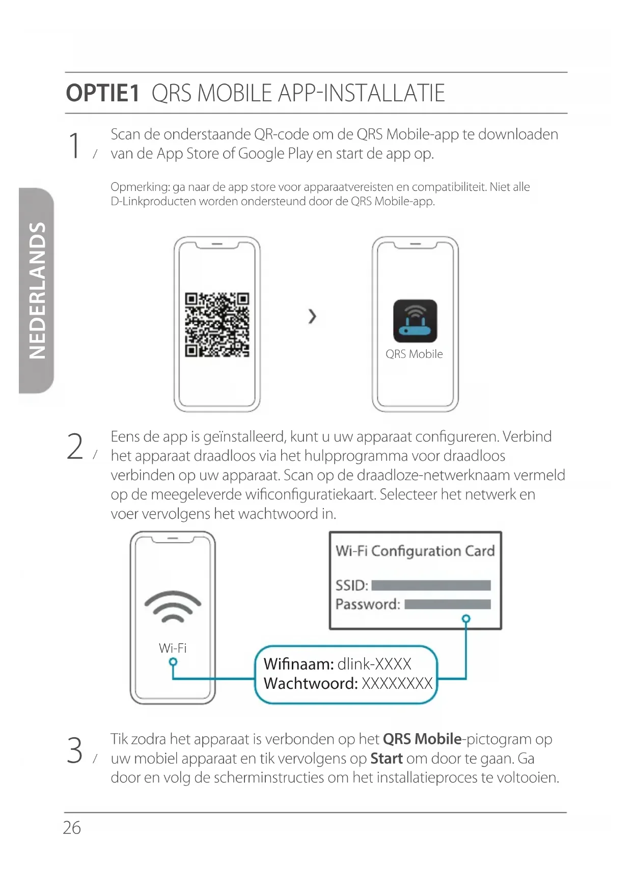 Scan de onderstaande QR-code om de QRS Mobile-app te downloaden van de App Store of Google Play en start de app op. Opmerking: ga naar de app store voor apparaatvereisten en compatibiliteit. Niet alle D-Linkproducten worden ondersteund door de QRS Mobile-app. 1 / QRS MobileEens de app is geïnstalleerd, kunt u uw apparaat configureren. Verbind het apparaat draadloos via het hulpprogramma voor draadloos verbinden op uw apparaat. Scan op de draadloze-netwerknaam vermeld op de meegeleverde wificonfiguratiekaart. Selecteer het netwerk en voer vervolgens het wachtwoord in. 2 / Wi-Fi Winaam: dlink-XXXX Wachtwoord: XXXXXXXX Tik zodra het apparaat is verbonden op het QRS Mobile-pictogram op uw mobiel apparaat en tik vervolgens op Start om door te gaan. Ga door en volg de scherminstructies om het installatieproces te voltooien. 3 /27 NEDERLANDS OPTIE 2 WEBBROWSERINSTALLATIE 1 / Sluit de extender aan op een stopcontact in de buurt van uw router. 2 / Wacht tot het ledlampje van de extender amber begint te knipperen.Opmerking: raadpleeg de gebruikershandleiding voor apparaatspecifiek ledgedrag. < 1 m < 1 m28 NEDERLANDS VEEL PLEZIER! Klaar voor gebruik! Sluit apparaten aan op uw netwerk met behulp van gebruikersnaam (SSID) en wachtwoord die u hebt aangemaakt bij de installatieprocedure. Typ http://dlinkap.local./ in de adresbalk van de webbrowser. Ga door en volg de scherminstructies om het installatieproces te voltooien. 4 / 3 / Sluit uw computer aan op het netwerk met wifinaam en wachtwoord afgedrukt op de snelinstallatiekaart of op het apparaatlabel van het apparaat. SNELINSTALLATIEKAART www.dlink.com Modelnaam: APPARAAT Winaam: d-link-XXXX Wachtwoord: XXXXXXXX S/N: 123456789 dlink-xxxxVerbindenxxxxxxxxxxxxxxxxxx Winaam: dlink-XXXX Wachtwoord: XXXXXXXX http://dlinkap.local./ II29 NEDERLANDS PLAATSING Een amberkleurige balk wijst op een zwak signaal. Plaats uw extender dichter bij uw router om de kwaliteit van het signaal te verbeteren. Zorg ervoor dat uw extender in een open omgeving is geplaatst. Plaast de extender binnen het bereik van uw router. Controleer het ledindicatielampje op uw extender of er een goede verbinding is. Groene balkjes wijzen op een sterk signaal < 1 m < 1 m < 1 m < 1 m Opmerking: raadpleeg de gebruikershandleiding voor apparaatspecifiek ledgedrag.30 NEDERLANDS VEELGESTELDE VRAGEN Waarom kan ik geen verbinding maken met mijn draadloze router of valt mijn draadloze verbinding weg? Ga na of uw extender binnen het bereik van uw router is. Probeer hem aan te sluiten op een plek dichter bij uw router en ga na of het signaalledlampje groen brandt. Bij het verlengen van een draadloos signaal van een router of access point zullen apparaten die verbonden zijn met de extender niet dezelfde snelheid/gegevensdoorvoer hebben dan wanneer ze rechtstreeks met de router zijn verbonden. Hoe wijzig ik de draadloze instellingen op mijn extender? Om uw wifinetwerknaam (SSID) en de beveiliging (wifiwachtwoord) te wijzigen, opent u de draadloze instellingen via: