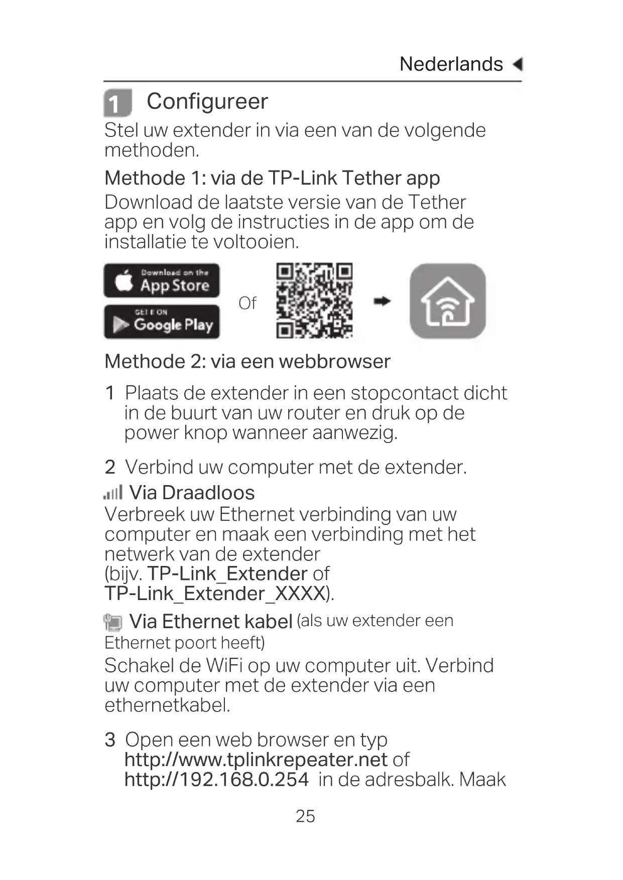 Configureer Stel uw extender in via een van de volgende methoden. Methode 1: via de TP-Link Tether app Download de laatste versie van de Tether app en volg de instructies in de app om de installatie te voltooien. Methode 2: via een webbrowser 1 Plaats de extender in een stopcontact dicht in de buurt van uw router en druk op de power knop wanneer aanwezig. 2 Verbind uw computer met de extender. Via Draadloos Verbreek uw Ethernet verbinding van uw computer en maak een verbinding met het netwerk van de extender (bijv. TP-Link_Extender of TP-Link_Extender_XXXX). Via Ethernet kabel (als uw extender een Ethernet poort heeft) Schakel de WiFi op uw computer uit. Verbind uw computer met de extender via een ethernetkabel. 3 Open een web browser en typ http://www.tplinkrepeater.net of http://192.168.0.254 in de adresbalk. Maak OfNederlands